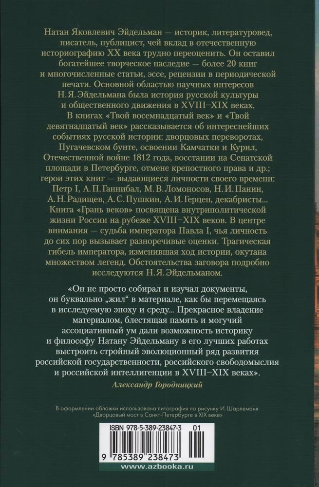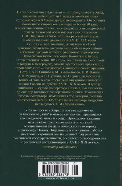 Nathan Yakovlevich Eidelman was a historian, literary critic, writer, and publicist whose contribution to the national historiography of the twentieth century can hardly be overestimated. He left a rich creative heritage - more than 20 books and numerous articles, essays, reviews in the periodical press. The main area of N. Y. Eidelman's scientific interests was the history of Russian culture and social movement in the XVIII-XIX centuries. The books "Your Eighteenth Century" and "Your Nineteenth Century" tell about the most interesting events of Russian history: palace coups, Pugachev's Rebellion, the development of Kamchatka and the Kurils, the Patriotic War of 1812, the uprising on Senate Square in St. Petersburg, the abolition of serfdom, and others.; the heroes of these books - outstanding personalities of their time: Peter I, AP Hannibal, MV Lomonosov, NI Panin, AN Radishchev, AS Pushkin, AI Herzen, Decembrists ... The book "The Edge of the Ages" is devoted to the internal political life of Russia at the turn of the XVIII-XIX centuries. In the center of attention - the fate of Emperor Paul I, whose personality still causes controversial assessments. The tragic death of the emperor, which changed the course of history, is shrouded in a multitude of legends. The circumstances of the conspiracy are studied in detail by N. Y. Eidelman.