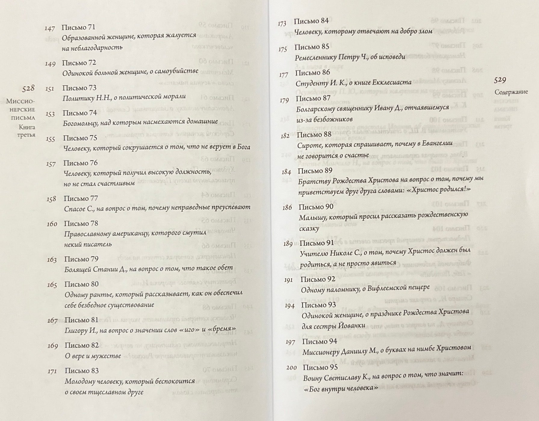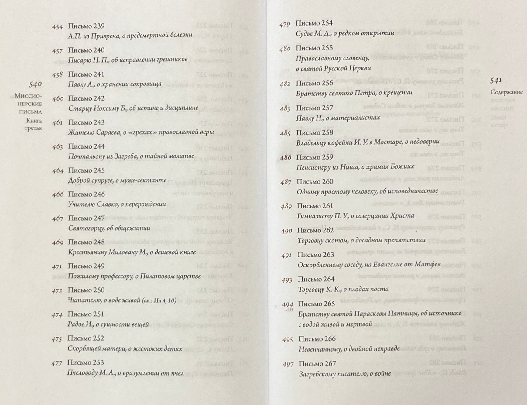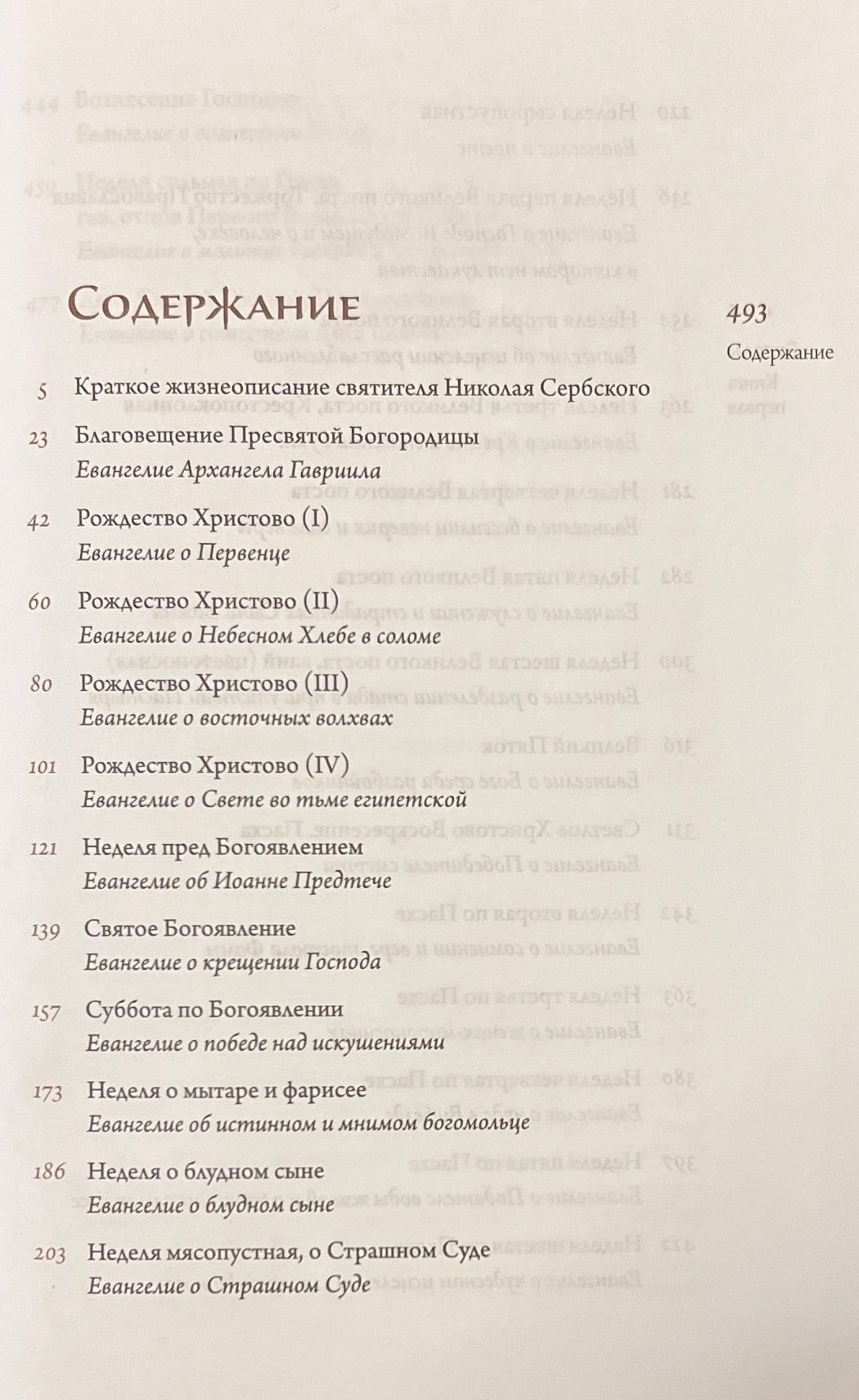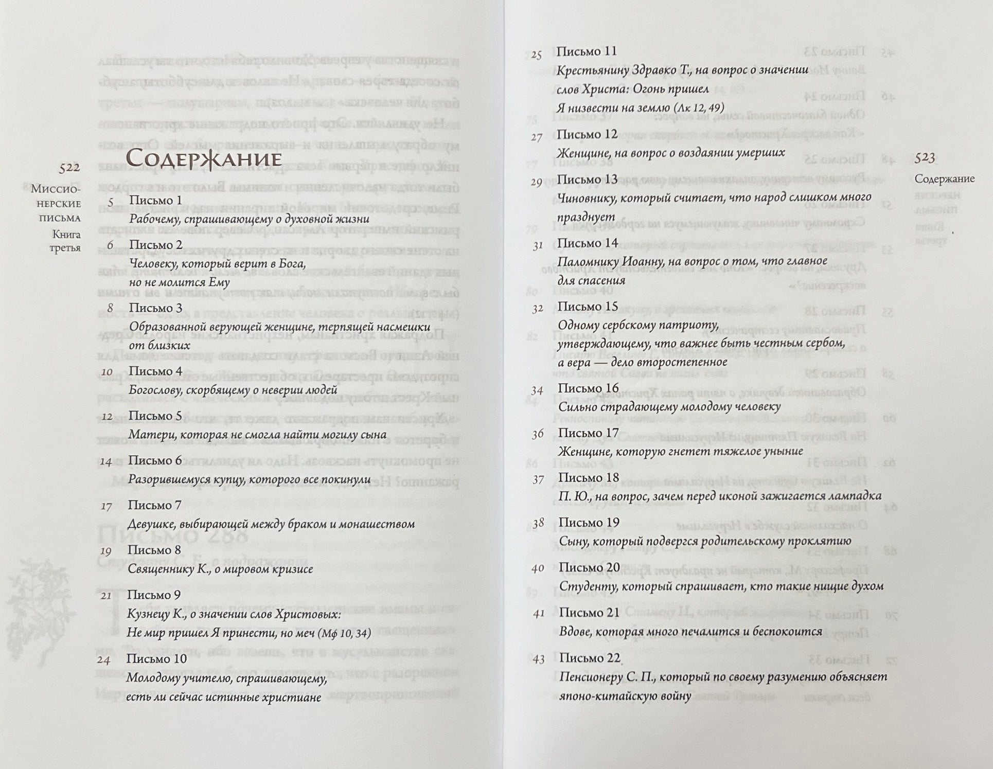 The first and second books of the collection include St. Nicholas of Serbia's talks on Sunday Gospel readings, given by him in different years. The third book of the collection includes "Missionary Letters" - the saint's answers to various questions from the laity.
