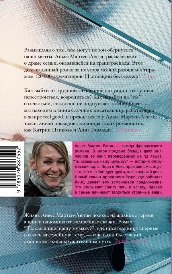 Agnès Martin-Lugan is the star of French romance and the bestselling author of Happy People Read Books and Drink Coffee. It was followed by You'll Do Well, My Darling, Book Lovers Don't Sleep Alone, and I'm Sorry, They're Waiting for Me.... More than two million of her books have already been sold worldwide, translated into 32 languages. "Can You Hear Our Music?" - is the story of a married couple. Barely on the shelves, the novel became a top seller. Vera and Janis have lived together for ten years and love each other like the first day. They have a wonderful family, three charming children. Their happiness attracts people like a magnet. Architect Janis, who dreams of his own design office, has a new friend and offers financial support. This opens the way to success for Janis, but the family's life is gradually falling apart. Vera begins to be disturbed by strange coincidences. However, neither Vera nor the readers expect such a denouement as Marten-Lugan has prepared this time.