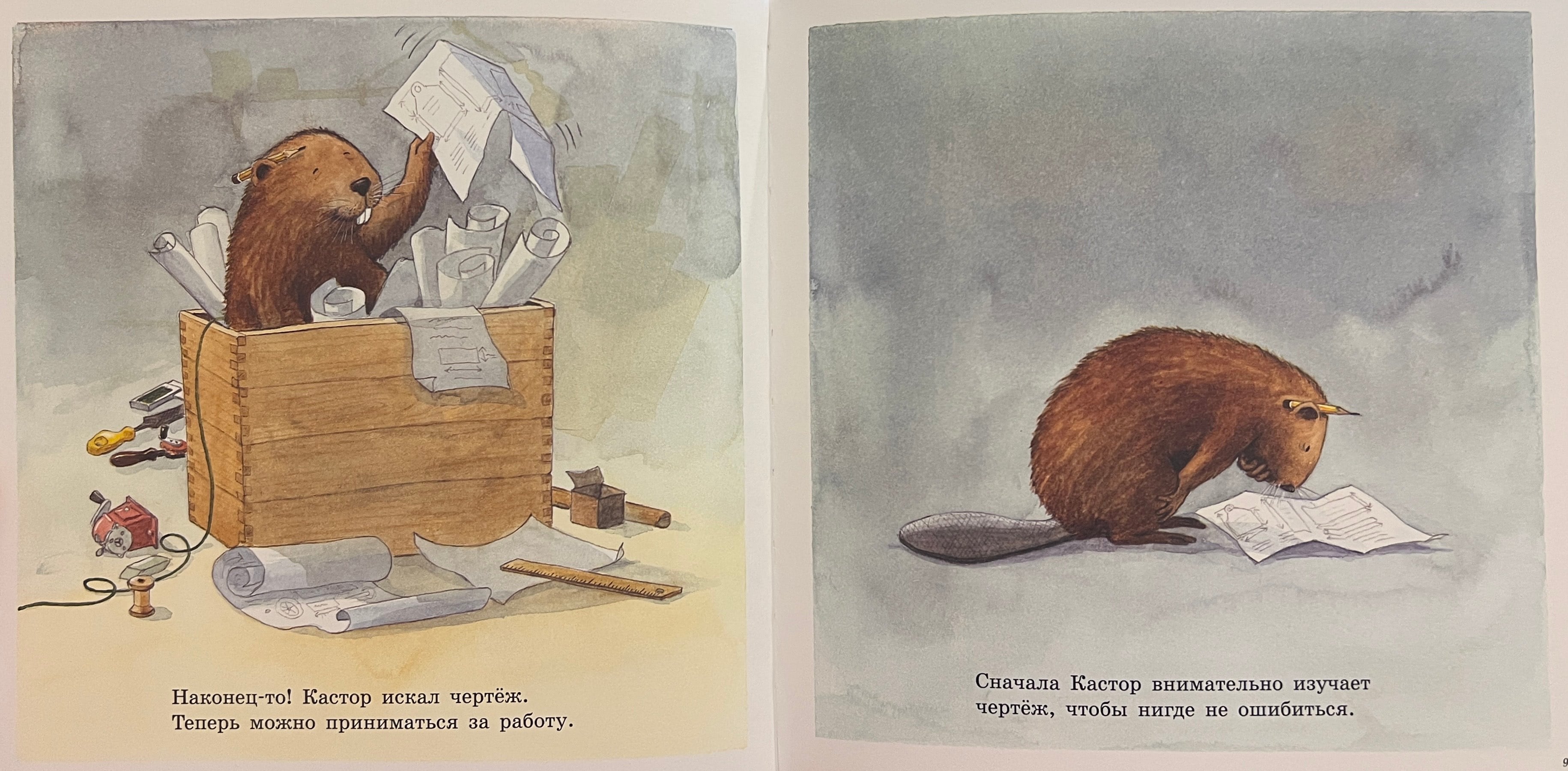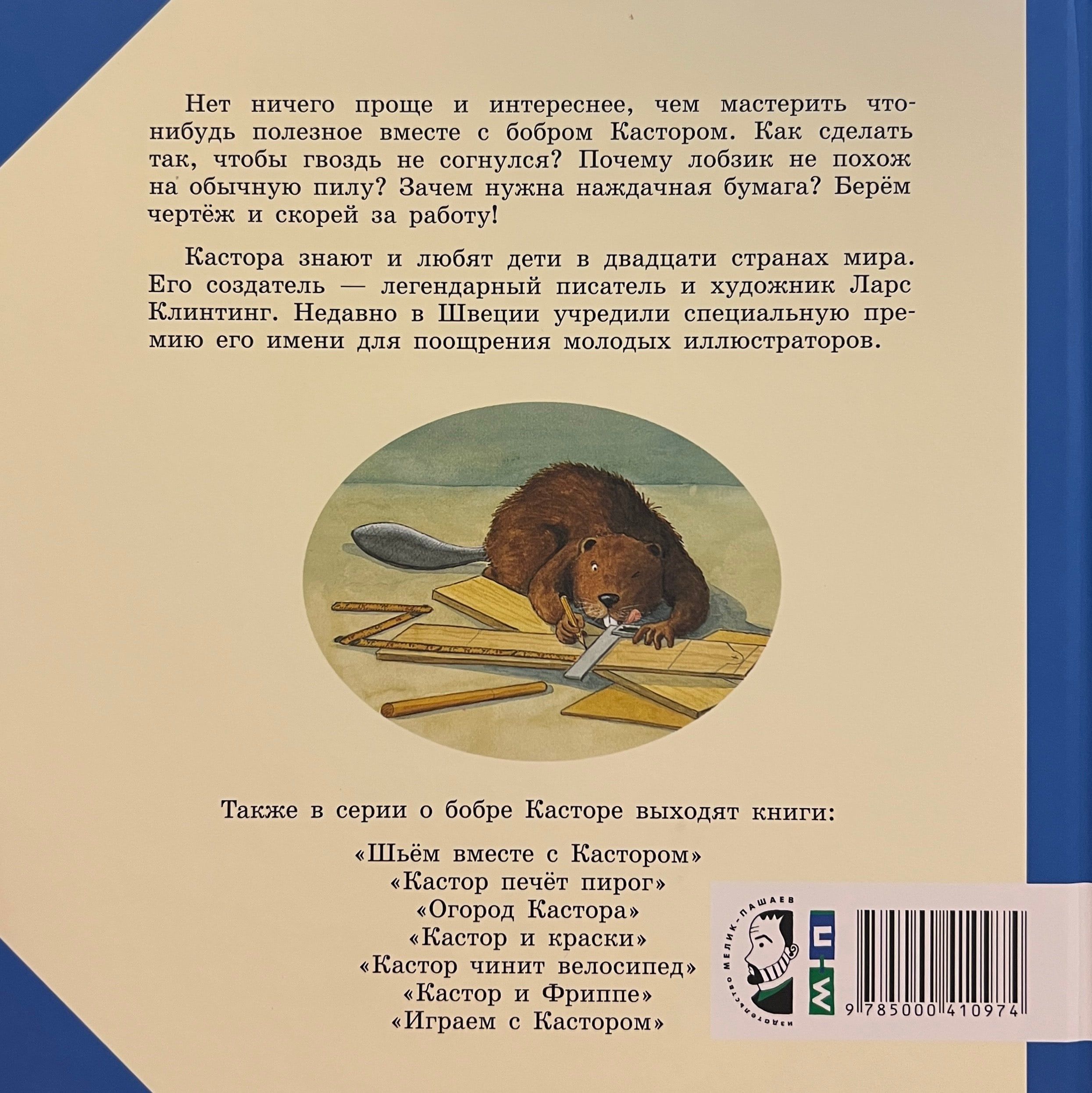 This time, Castor the beaver decides to make a wooden toolbox himself. He takes a drawing, draws out the planks using a folding ruler and a square, cuts out the parts with a saw and a jigsaw, drills holes in the right places, sands the blanks with sandpaper and finally connects all the parts with screws and nails. Done! Each step in creating a wooden box is illustrated and described in detail, and in addition, all the tools that will be needed for the job are drawn in detail and listed, including a hacksaw, jigsaw, brace, mallet, hand drill, pliers, hammer, screwdriver and others. Isn't this the first encyclopedia of tools for boys? And at the end of the book - an accurate drawing of the box with all the dimensions, so that after reading the book, dads can immediately get down to business with their sons - without putting it off for a long time! The book is perfect for creative leisure with children aged 3-6. Beaver Castor is known and loved by children in twenty-five countries around the world. Its creator is the legendary Swedish children's writer and illustrator Lars Klinting, winner of many international awards.