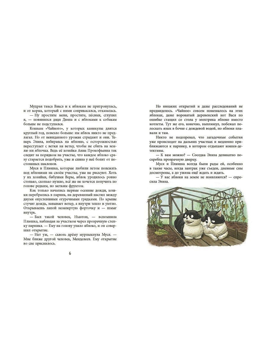 Plushka is smart, Musya is kind, and Eliza is brave. The three of them form an unbeatable feline detective agency that can solve any mysterious incident in the gardening village of Chine. They will uncover the secret of the apples under the birch tree, they will not be afraid of the haunted house and the mysterious laboratory at the edge of the village. Thanks to their intervention, a future pumpkin harvest will be saved and a missing turtle will be found. But even the smartest cats of our time are bound to make mistakes: their professional habit of suspecting everyone around them. It is good that friends are always ready to come to the rescue - a cat-trickster Vasya and a well-mannered Maine Coon Van Gogh, a wise dachshund Vaksa, sheepdogs Fox and Wolf, a brave little dog Charlie and other four-legged inhabitants of gardening. And sometimes people. Who never realized that next to them live real geniuses of detective work! Before you is the second book of adventures of the feline detective agency - with cheerful illustrations by Olga Gromova.