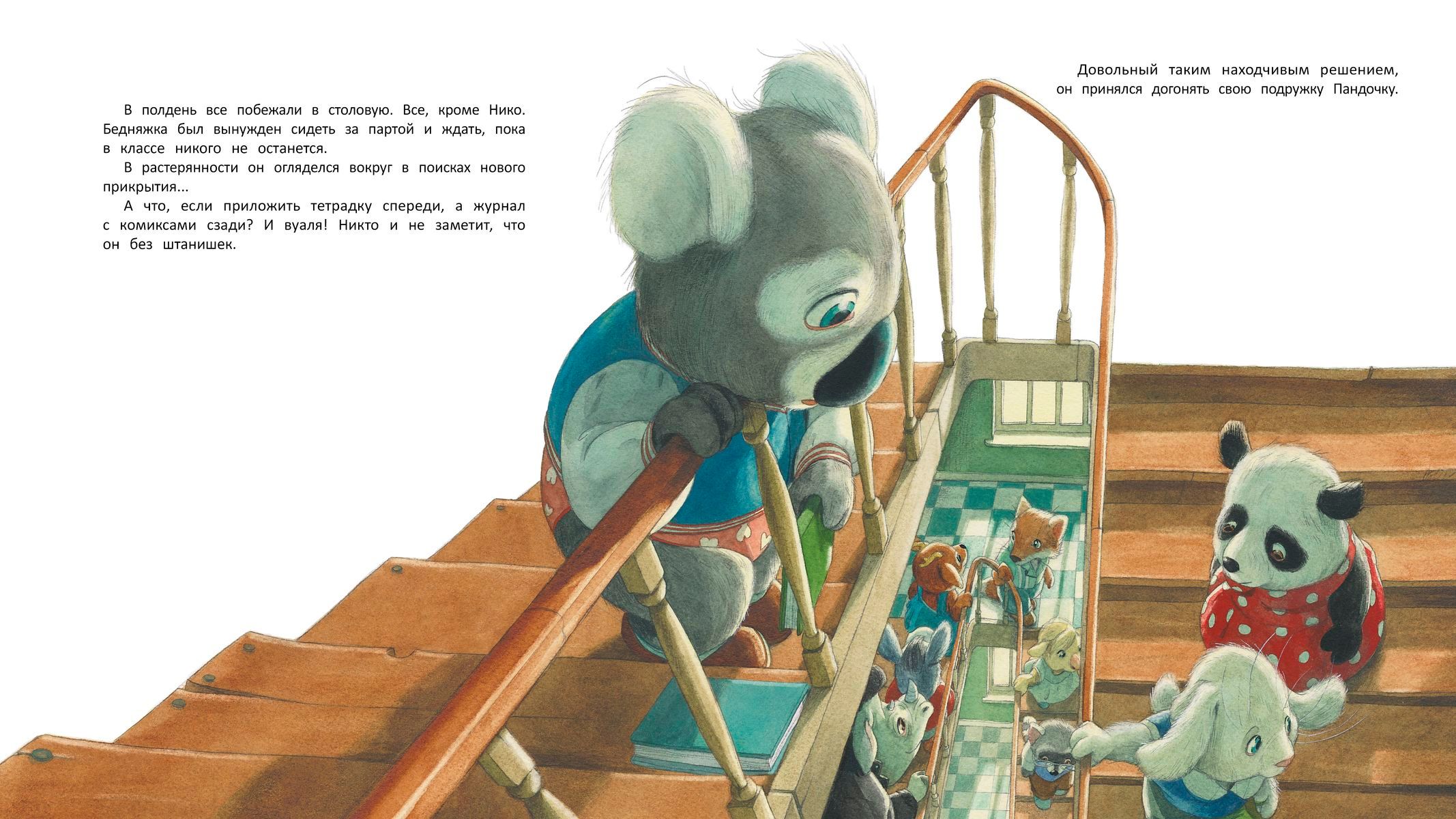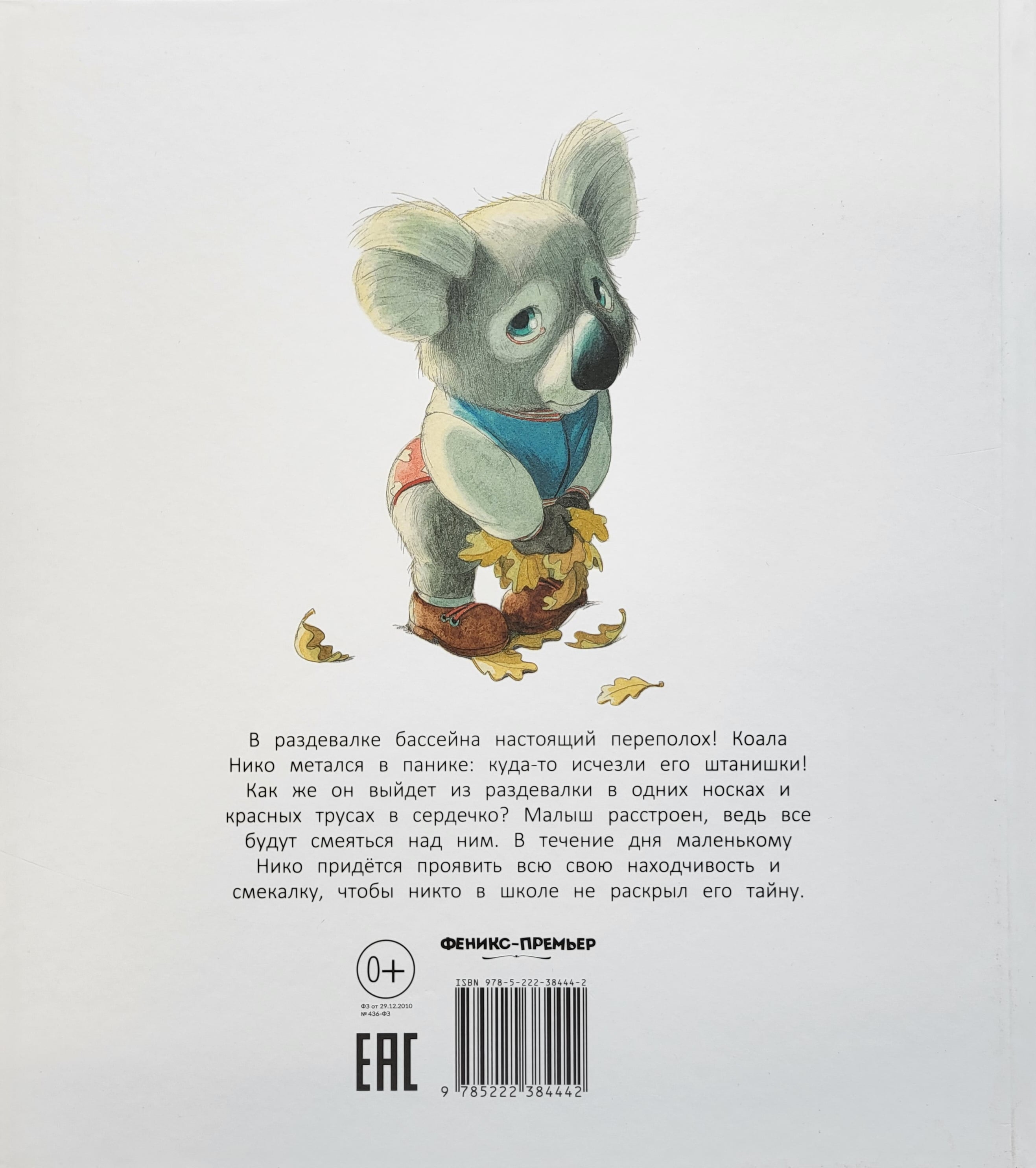 The pool locker room was in an uproar. Niko the koala was in a panic: his pants had disappeared. How is he going to get out of the changing room in just his socks and red heart underpants? The kid is upset because everyone will laugh at him. During the day little Niko will have to show all his ingenuity and wit to make sure that no one at school reveals his secret.