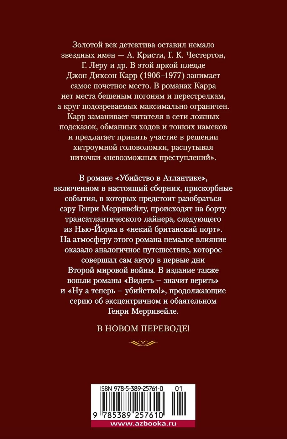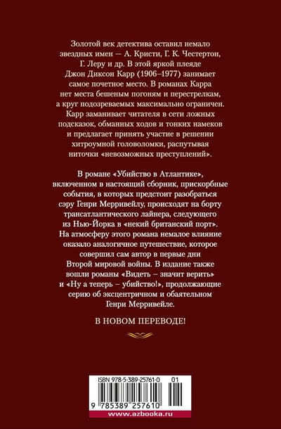 The Golden Age of detective fiction left many stellar names - A. Christie, G. K. Chesterton, G. Leroux, etc. In this bright galaxy, John Dickson Carr (1906-1977) occupies the most honorable place. In Carr's novels, there is no place for wild chases and shootouts, and the circle of suspects is as limited as possible. Carr lures the reader into a network of false clues, deceptive moves and subtle hints and invites him to take part in solving a cunning puzzle, unraveling the threads of "impossible crimes". In the novel "Murder in the Atlantic", included in this collection, the unfortunate events that Sir Henry Merrivale must sort out take place on board a transatlantic liner traveling from New York to "a certain British port". The atmosphere of this novel was greatly influenced by a similar journey that the author himself made in the early days of World War II. The edition also includes the novels "Seeing is Believing" and "Now for Murder!", continuing the series about the eccentric and charming Henry Merrivale.
