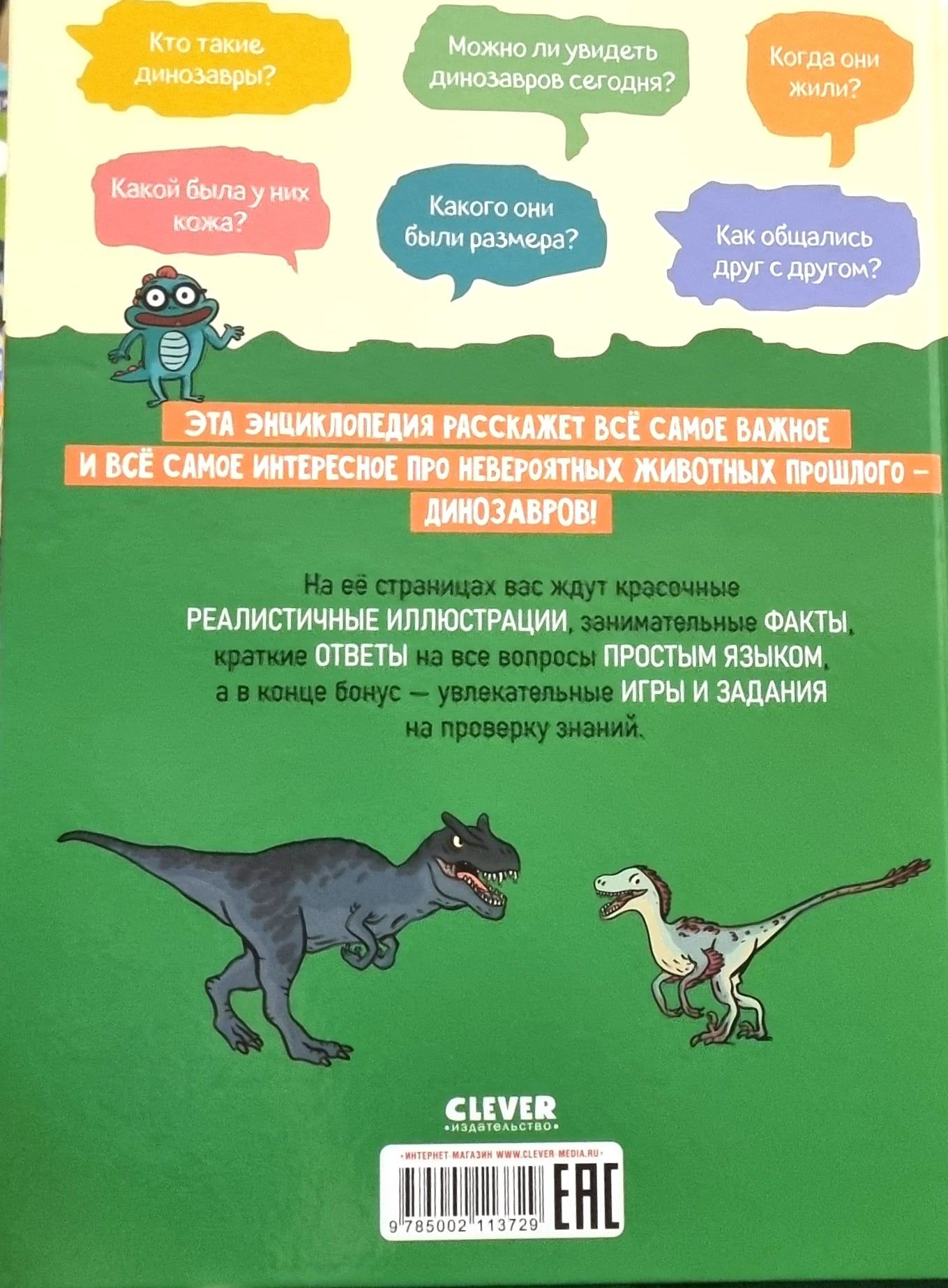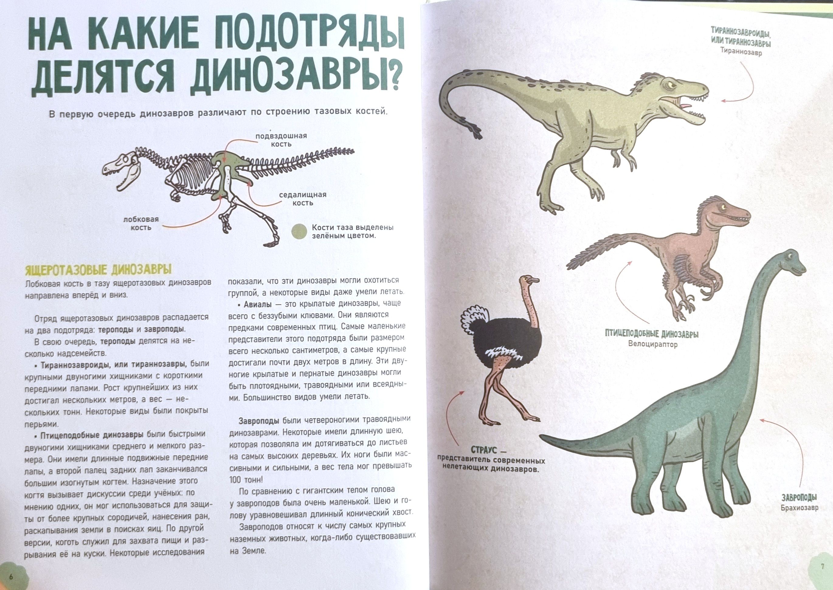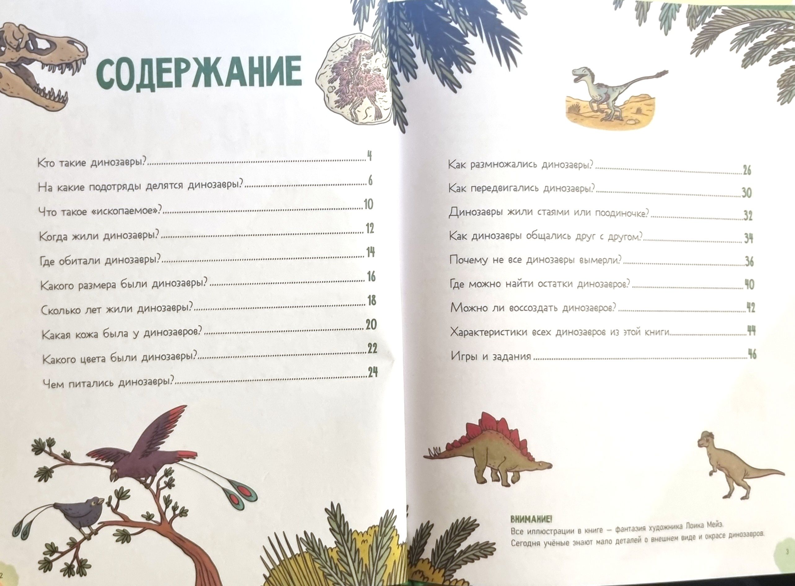 In the encyclopedia "Amazing Dinosaurs" on each page the young reader will find a new topic: when did they live (Triassic, Jurassic, Cretaceous periods); where did they live (in the forest, in the desert, in the swamp); what size were they (from 20 cm to 37 meters); what was the skin of dinosaurs, color, food preferences, how did they communicate with each other and much, much more!