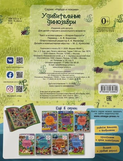 "Amazing Dinosaurs" from the "Find and Show" series is a book with beautiful illustrations and engaging activities. Each spread features bright, cheerful, detailed pictures, and the child is tasked with finding 10 objects on each. Each picture is themed differently, so there's no chance of getting bored! The book features a large, child-friendly format, making all the illustrations large and easy to see. This book, designed for older preschoolers, will not only enrich their time but also help develop perseverance and attention—qualities essential for every future schoolchild.