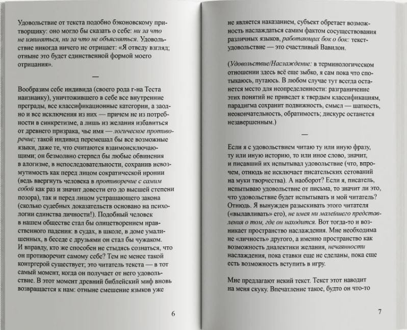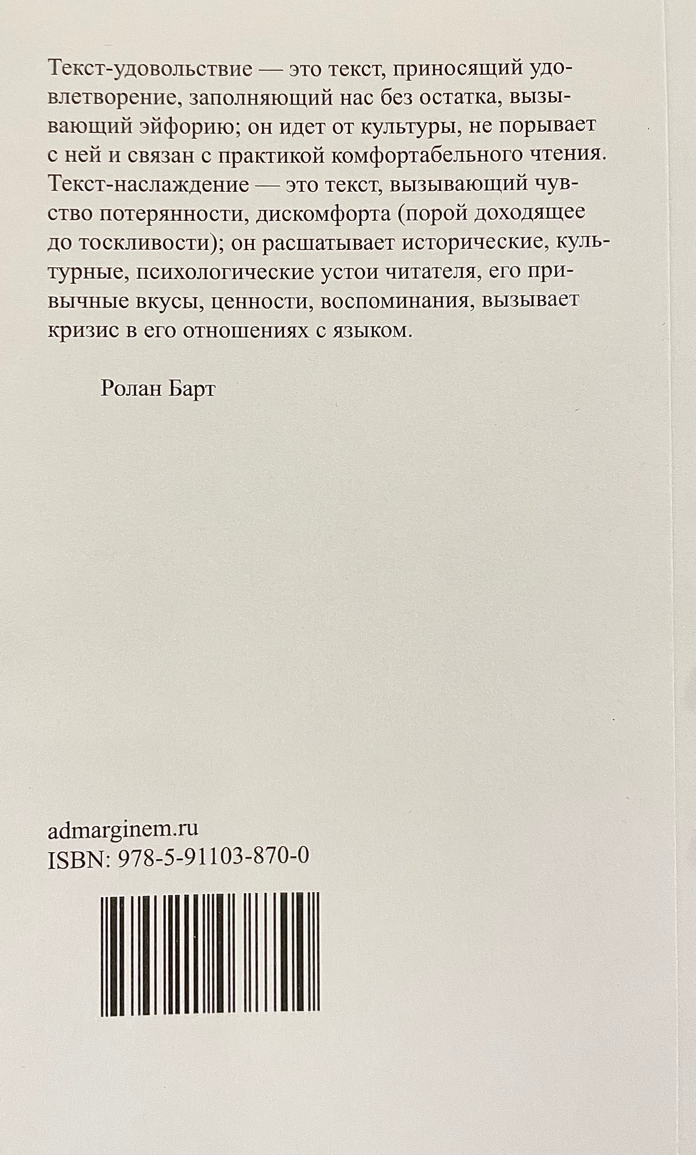 "The Pleasure of the Text" (1973) is an essay by French philosopher, literary scholar and semiotician Roland Barthes, in which he examines in detail the relationship between the text, the reader and the pleasure of reading. Developing the ideas of Lacanian psychoanalysis, the author contrasts two types of pleasure from the text - through the concepts of plaisir ("pleasure") and jouissance ("enjoyment") - and divides texts into "readable" and "written". According to Barthes, the meaning of the text is not fixed, and when reading, each reader brings their own experience and interpretations, allowing for a plurality of meanings. This work challenges views on authorship and pays special attention to the subjectivity of the reader, emphasizing his or her role in creating the meaning of the text.