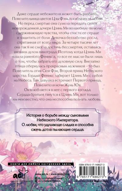 Even the heart of a celestial can be broken..... The flower lord Zi Feng died for love. But before she died, she managed to give her newborn daughter Jin Mi a magic pill that restrains feelings to save her heart and protect her from pain. The girl grew up carefree, hidden from the world. In four thousand years, she had never been able to achieve immortality, remaining an inferior wine-grape spirit. Therefore, when Jin Mi found the wounded Phoenix, all her thoughts were only about taking away its spiritual power. Suddenly, the bird turned into a beautiful man - that was Fire Lord Xu Feng, the Second Prince of the Heavenly Realm. The proud Phoenix takes Jin Mi with him to Heaven. There, the girl meets the First Prince, the Lord of the Night, Rong Yu. He falls in love with her at first sight. The brothers' hearts are drawn to Jin Mi, but they do not know that she is incapable of knowing love....