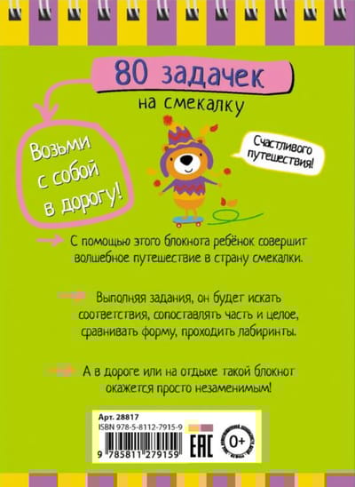 Opening this notebook will transport your child to a magical land where they'll need to use their wits. They'll search for hidden animals, connect halves, match up fragments of pictures, examine cloud drawings, and come up with picture names. This notebook is indispensable on the road or on vacation.