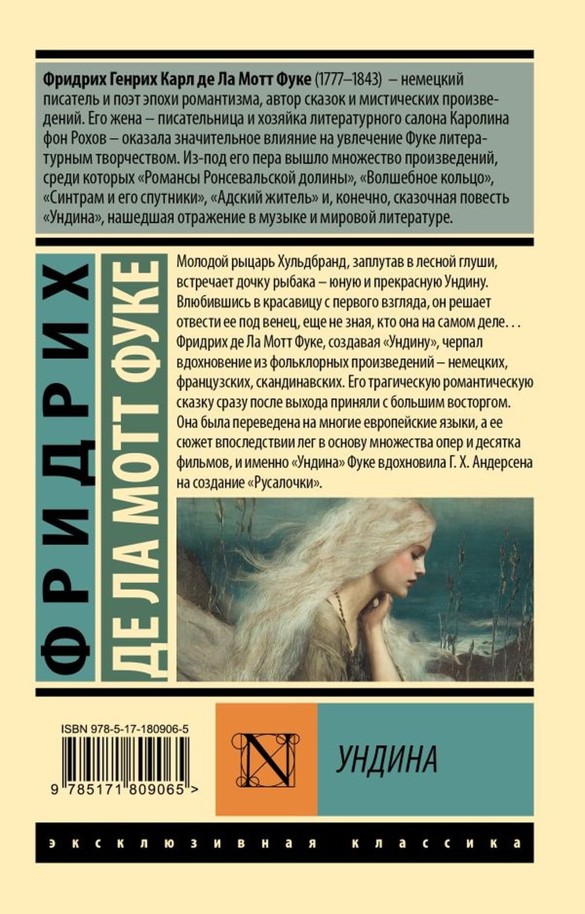 Friedrich de la Motte Fouqué, in creating "Ondine," drew inspiration from folklore—German, French, and Scandinavian. His tragic romantic tale was immediately received with great acclaim upon its publication. It was translated into many European languages, and its plot subsequently formed the basis for numerous operas and dozens of films. It was Fouqué's "Ondine" that inspired Hans Christian Andersen to create "The Little Mermaid."