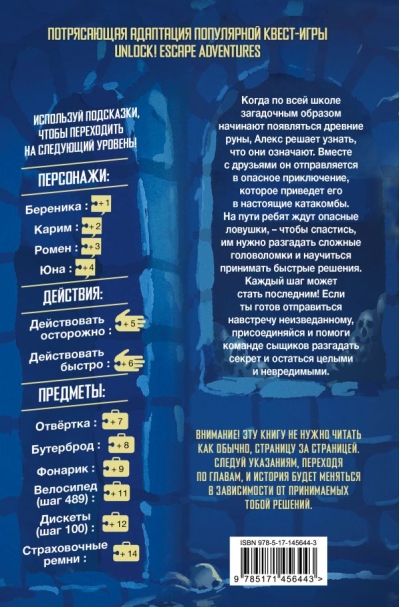 When ancient runes mysteriously start appearing all over the school, Alex decides to find out what they mean. Together with his friends he goes on a dangerous adventure that will lead him to the real catacombs. On the way the guys are waiting for dangerous traps, - to save themselves, they need to solve complex puzzles and learn to make quick decisions. Every step can be the last! If you're ready to set out to meet the unknown, join in and help the team of detectives to solve the secret and stay safe and sound. Warning: This book does not need to be read page by page. Follow the directions as you move through the chapters, and the story will change depending on the decisions you make.