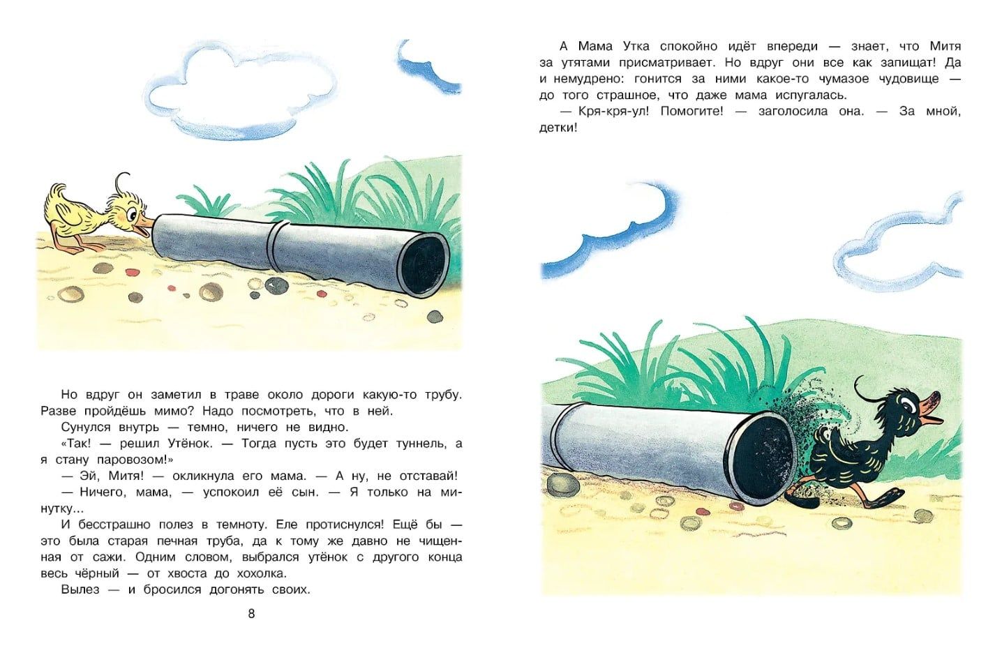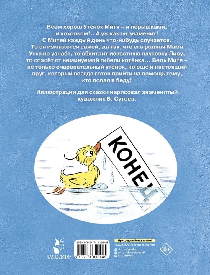 The book includes a fairy tale by M. Mikhailov about the brave, mischievous, and inquisitive Duckling Mitya. This fidgety feathered creature gets into various mishaps every day, but Mitya always comes out unscathed. No wonder he's a Duckling! Mitya also has many friends, as he's always ready to help anyone in trouble.