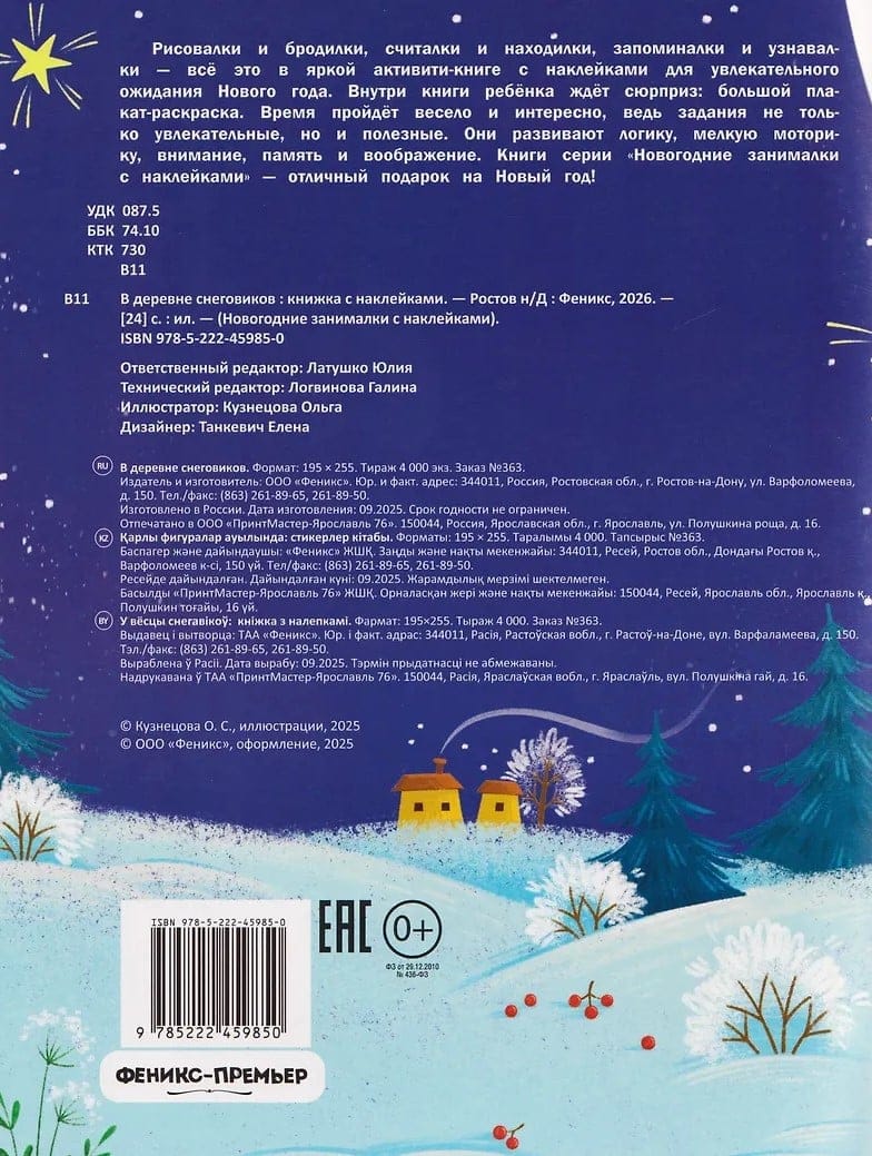 Drawing and walking games, counting and finding games, memory and recognition games—all in a bright activity book with stickers for an exciting New Year's Eve. Inside, a surprise awaits your child: a large coloring poster. Time will pass joyfully and interestingly, as the tasks are not only engaging but also useful. They develop logic, fine motor skills, attention, memory, and imagination.