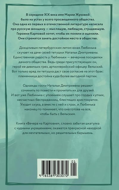 The book "Evenings on Karpovka", like a forgotten box of wonderful jewelry, will prove to be a wonderful find for dreamy but determined young ladies.