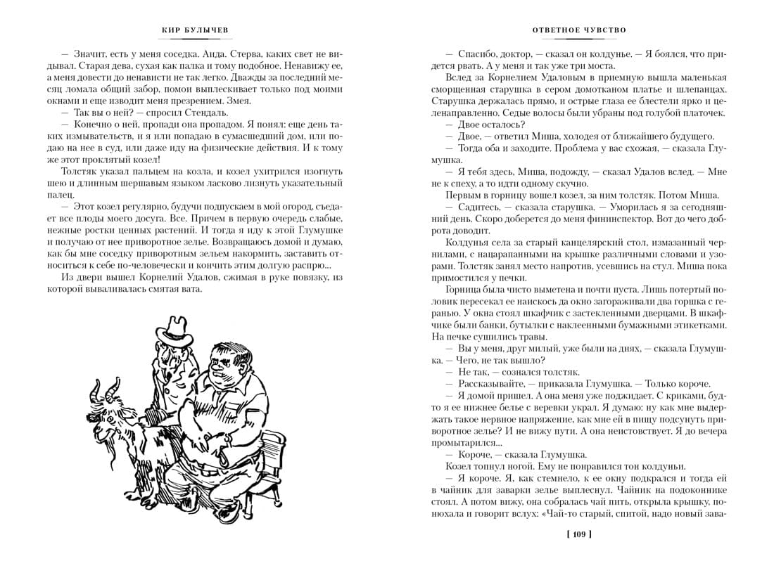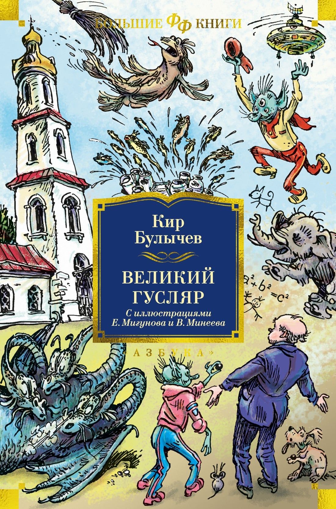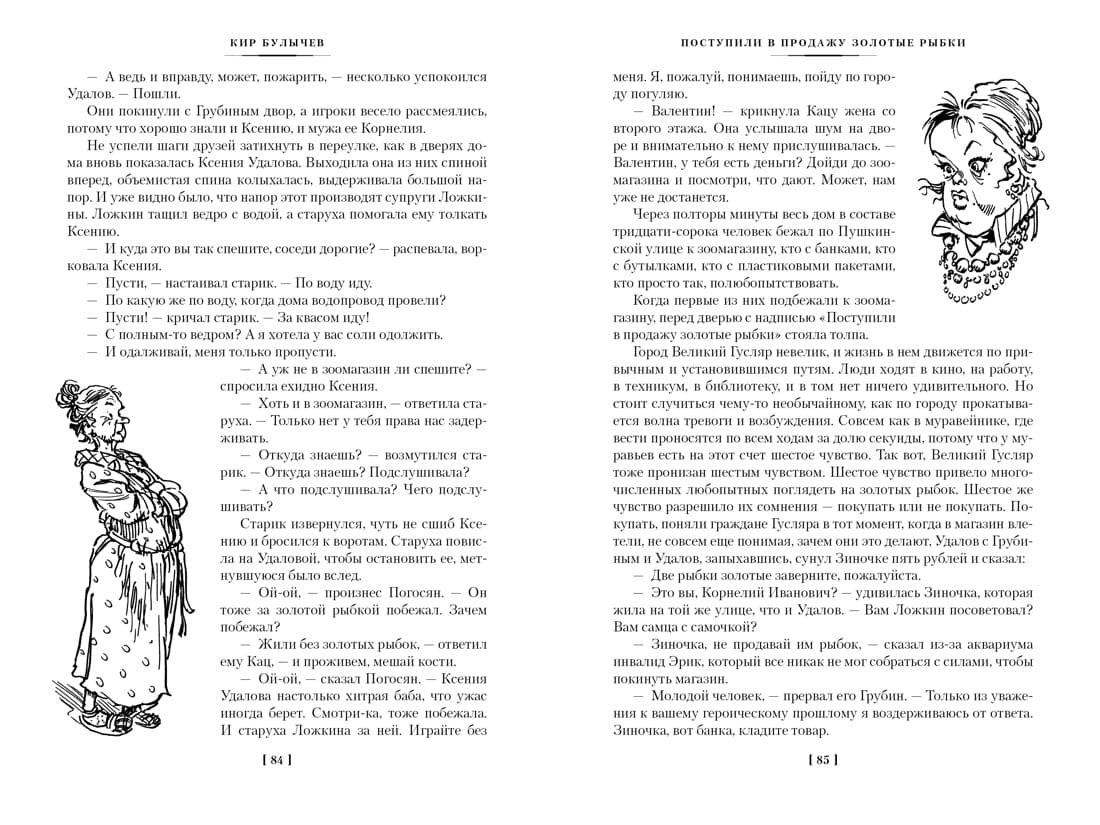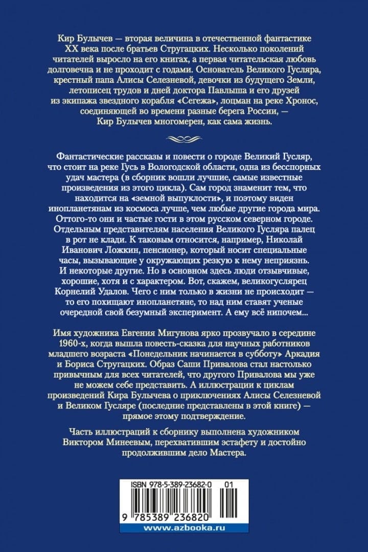 Kir Bulychev is the second magnitude in the domestic fiction of the XX century after the Strugatsky brothers. Several generations of readers grew up on his books, and the first reader's love is long-lasting and does not pass with the years. Founder of the Great Guslyar, godfather of Alice Selezneva, a girl from the future of the Earth, chronicler of the works and days of Dr. Pavlysha and his friends from the crew of the interplanetary starship "Segezha", pilot on the river Chronos, connecting different shores of Russia in time - Kir Bulychev is multidimensional, like life itself, in his literary universe there is a place and humorous prank, and caustic, merciless irony, and the wisdom of a scientist and visionary. It has everything but boredom. Fantastic stories and tales about the city of Veliky Guslyar, which stands on the river Gus in the Vologda region, one of the undisputed successes of the master (the collection includes the best, most famous works from this cycle). The city itself is famous for the fact that it is located on the "earth's bulge", and therefore visible to aliens from space better than any other city in the world. That is why they are frequent guests in this Russian northern city. Some representatives of the population of Great Guslar do not put a finger in the mouth. For example, Nikolai Ivanovich Lozhkin, a pensioner who wears a special watch that makes people around him strongly dislike him. And some others. But mostly people here are responsive, good, though with a temper. Here, for example, the big-mouthed Korneliy Udalov. What only with him in life does not happen - then he is abducted by aliens, then over him put scientists another of their crazy experiments. And he can't cope with everything... The name of artist Yevgeny Migunov brightly sounded in the mid-1960's, when the story-tale for young scientists "Monday Begins on Saturday" Arkady and Boris Strugatsky. The image of Sasha Privalov has become so familiar to all readers that we can no longer imagine another Privalov. And the illustrations to the cycles of Kir Bulychev's works about the adventures of Alice Selezneva and the Great Guslyar (the latter are presented in this book) are a direct confirmation of this. Part of the illustrations for the collection is made by the artist Victor Mineyev, who took over the baton and worthily continued the Master's work.