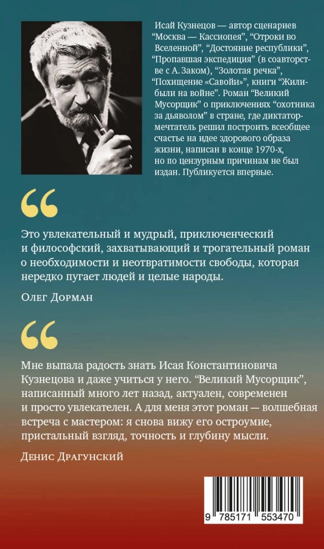"The Great Scavenger" - a sharp novel about the adventures of the "devil hunter" in a small country called Lacuna, where the dictator-dreamer conceived to make his people happy, declaring the national idea of a healthy lifestyle. And the goal seems to be almost achieved: sanitary and correctional camps are built, strict birth control is carried out, vineyards are cut down (wine is evil), but then a young Frenchman, a researcher of ancient beliefs, sneaks into Lacuna, which is closed to foreigners. His plans to study the forbidden cult of the devil are disrupted by his sudden love for the dictator's daughter, and all the state security forces are thrown into his search. Meanwhile, the devil worshippers are preparing to celebrate the equinox, and the dictator's daughter disappears....