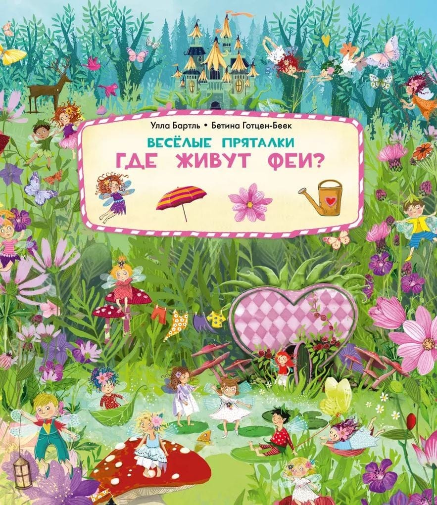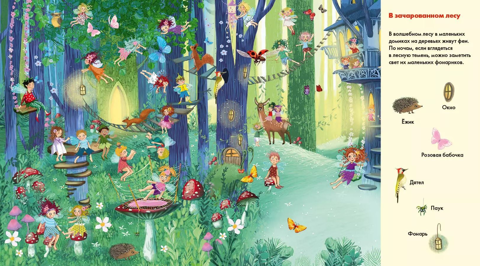 The main thing is to look carefully at the pictures and find animals, birds, insects and many curious things that surround the merry fairies.