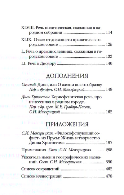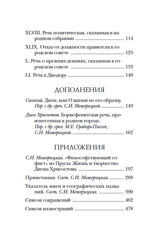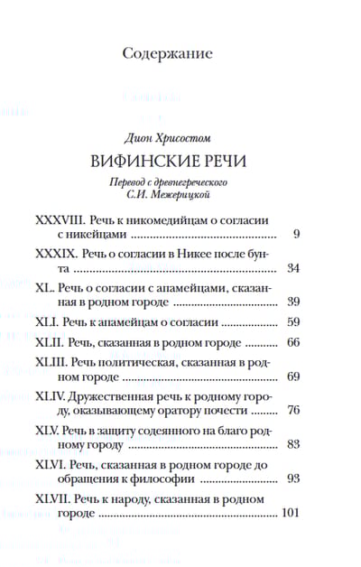 The accompanying article by S.I. Mezheritskaya, which contains a detailed overview of the biography and works of the orator, as well as the history of their later study and reception, taking into account all the most important classical and modern works of Western European and domestic scholars devoted to Dion Chrysostomus, allows us to immerse ourselves in the world depicted in the speeches.