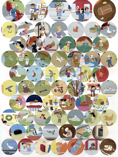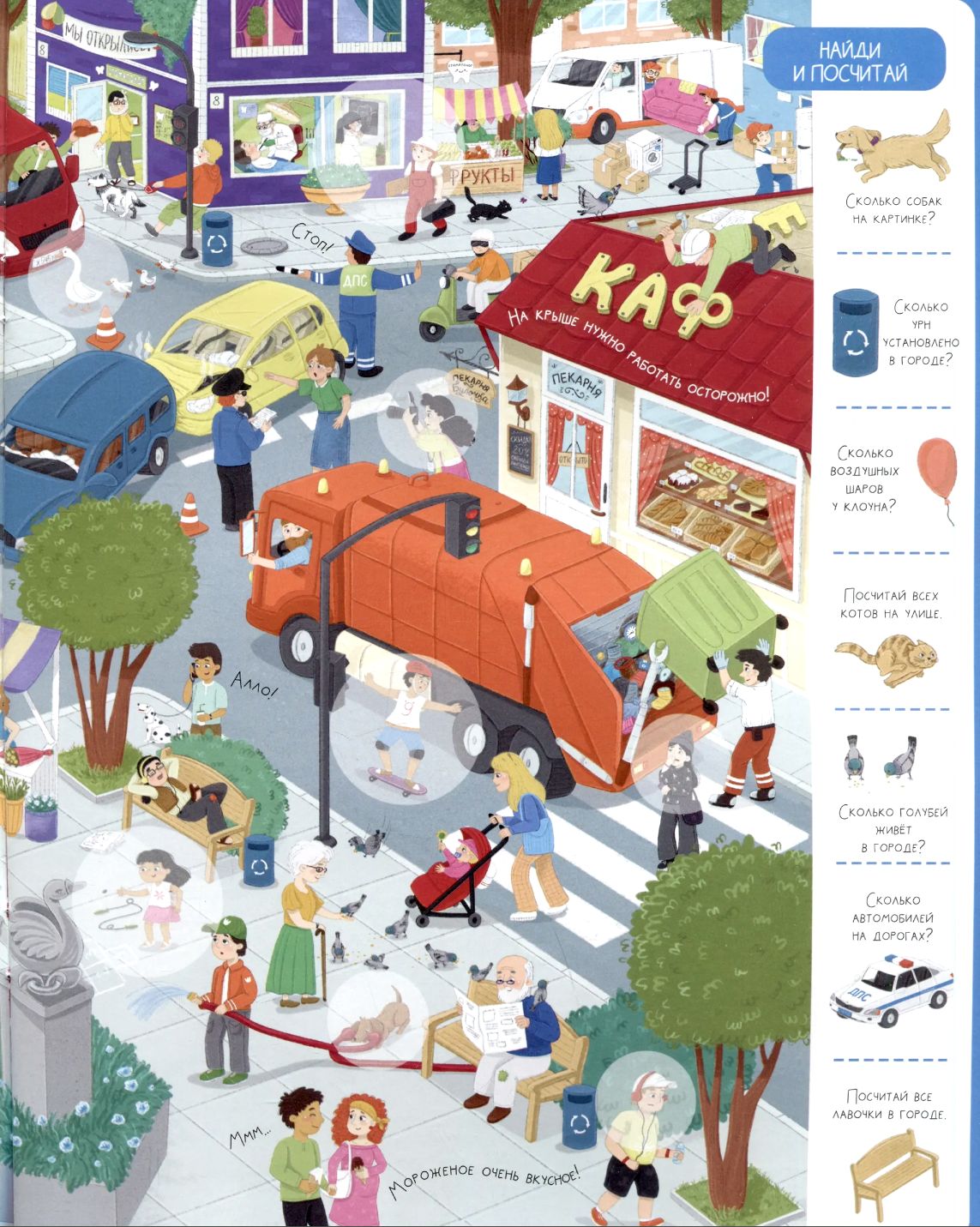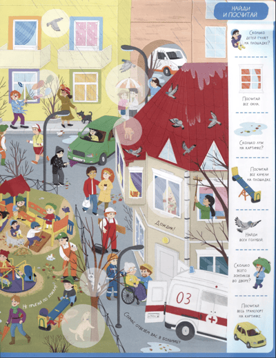 Wimmelbook with stickers. In the city
