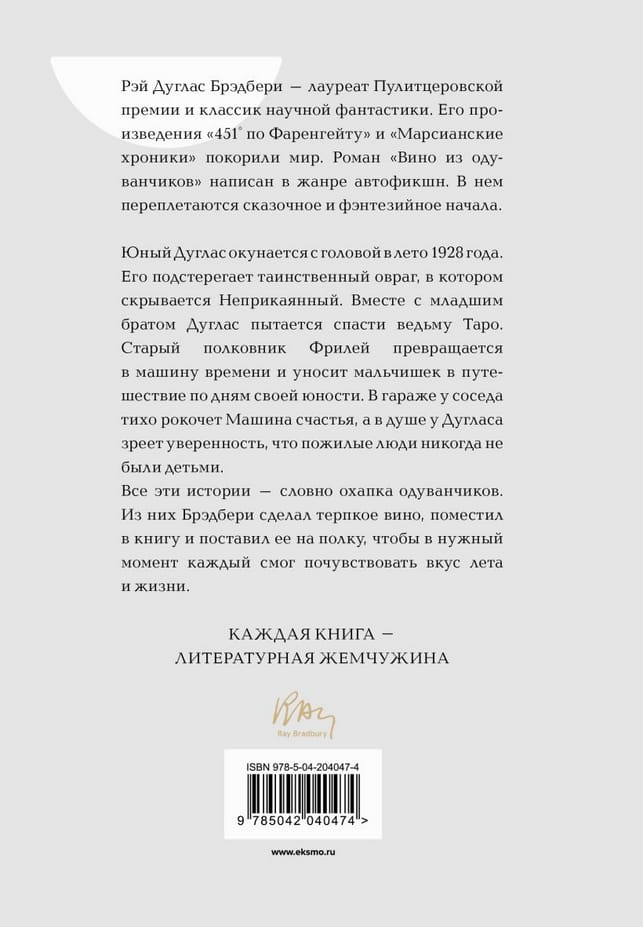 Ray Douglas Bradbury is a Pulitzer Prize winner and a classic of science fiction. His works "451° Fahrenheit" and "The Martian Chronicles" conquered the world. The novel "Dandelion Wine" is written in the genre of autofiction. It intertwines fairy tale and fantasy beginnings.