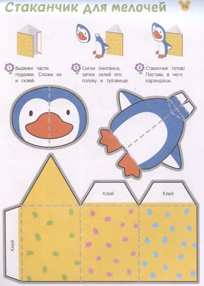 Cutouts for five-year-olds will teach a child to assemble puzzles and glue 3D crafts. From each page, the child will make a craft that can be played with.