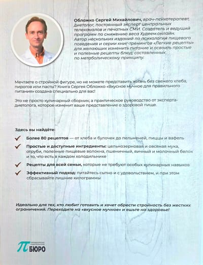 In his new book, "Delicious Flour for Healthy Eating," nutritionist and psychotherapist Sergey Oblozhko once again proves that weight loss requires simple and delicious food. The book features over 80 diverse recipes for every taste: from aromatic bread and fluffy buns to pizza, dumplings, pancakes, and desserts. And all of this is for slimming down! The secret lies in reducing calorie density, using whole-grain, oat, and bran flours, wheat protein, and soluble fiber. Dishes prepared according to these recipes will delight the whole family and will become your reliable assistant in making the transition to healthy eating easy and comfortable. Turn your weight loss into a pleasure.