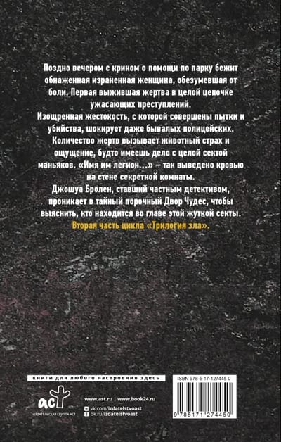 Late at night, a naked, scarred woman, mad with pain, runs through the park screaming for help. The first survivor in a string of horrific crimes. The sophisticated brutality with which the torture and murders are committed shocks even experienced police officers. The number of victims causes animal fear and the feeling of dealing with a whole sect of maniacs. "Their name is legion..." - is written in blood on the wall of the secret room. Joshua Brolen, who became a private detective, penetrates the secret vicious Court of Wonders to find out who is at the head of this terrible sect. The second installment of the Evil Trilogy series.