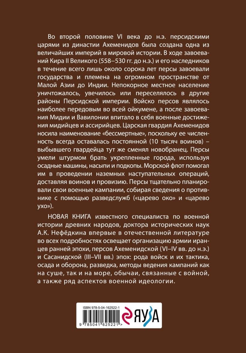 The new book by the famous specialist in the military history of ancient peoples, Doctor of Historical Sciences A.K. Nefedkin, for the first time in Russian literature, covers in detail the organization of the army of the Iranians of the early era, the Persians of the Achaemenid (6th-4th centuries BC) and Sassanid (3rd-7th centuries) eras: types of troops and their tactics, siege and defense, reconnaissance, methods of conducting campaigns both on land and at sea, customs associated with war, as well as a number of aspects of military ideology.