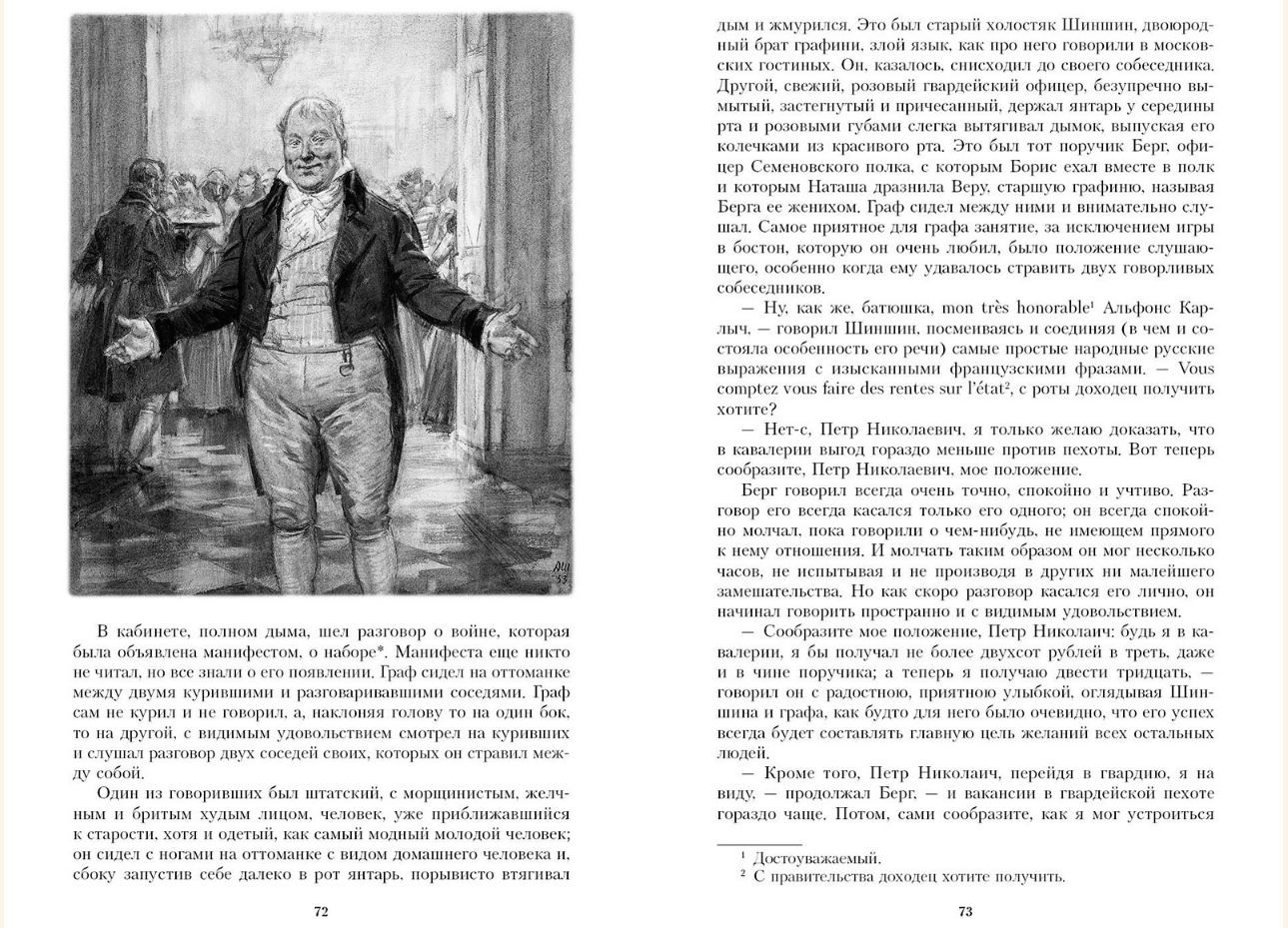 With his novel War and Peace, L. N. Tolstoy created a grand literary canvas about Russia at the beginning of the 19th century. A detailed chronicle of the lives of several noble families, large-scale battle scenes, an accurate portrait of society with its ideology, philosophy, and everyday life - in all the details of the novel, researchers recognize the author's "highest artistic objectivity". The writer studied the Russian character using several hundred characters as an example. Some of them are historical figures, while others are based on prototypes, including members of Tolstoy's own family. The writer used an incredible number of historical sources, archival materials, family legends, and memoirs, from which an entire library was assembled. With this edition, the classic illustrations of Dementiy Alekseevich Shmarinov, which are part of the golden fund of Russian book graphics, return to the reader. Incredibly alive, as if drawn from life, they are in amazing harmony with the text of one of the central works of world literature.