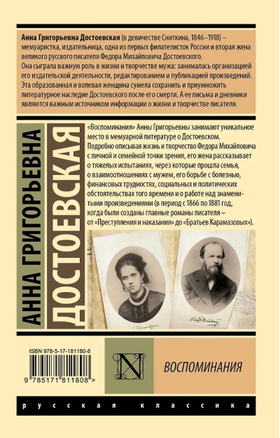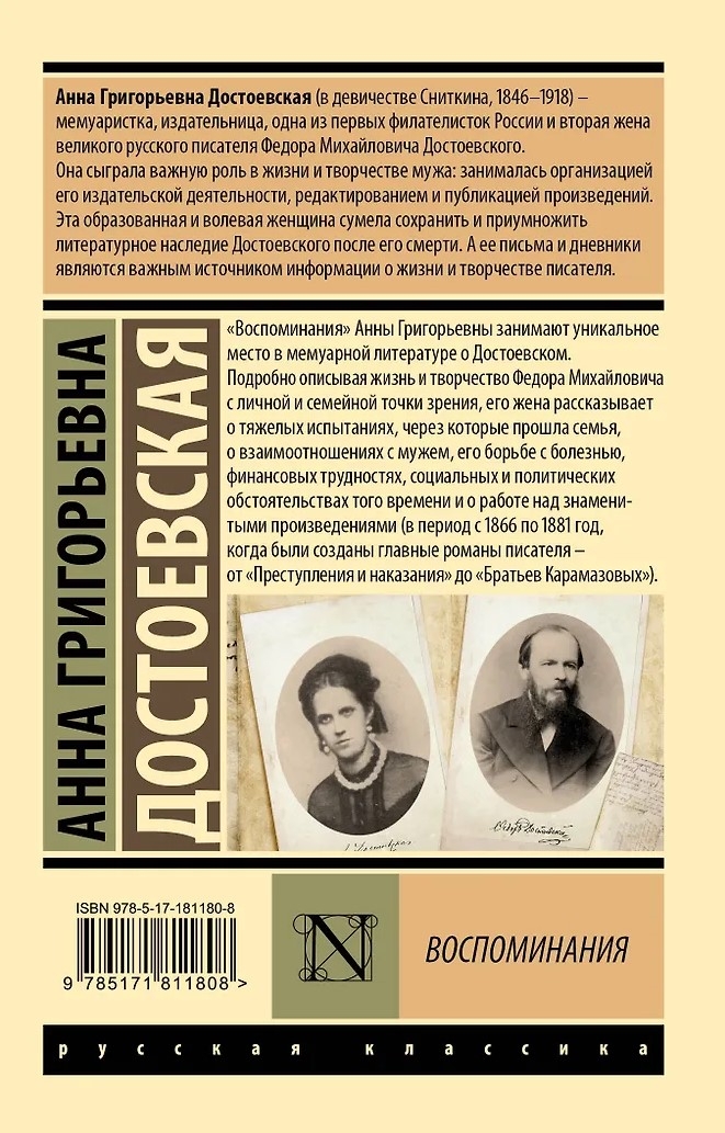 Anna Grigoryevna's "Memoirs" occupy a unique place in the memoir literature about Dostoevsky. Detailing the life and work of Fyodor Mikhailovich from a personal and family perspective, his wife recounts the difficult trials the family endured, her relationship with her husband, his struggles with illness, financial difficulties, the social and political circumstances of the time, and her work on his famous works (from 1866 to 1881, when the writer's major novels, from Crime and Punishment to The Brothers Karamazov, were written).