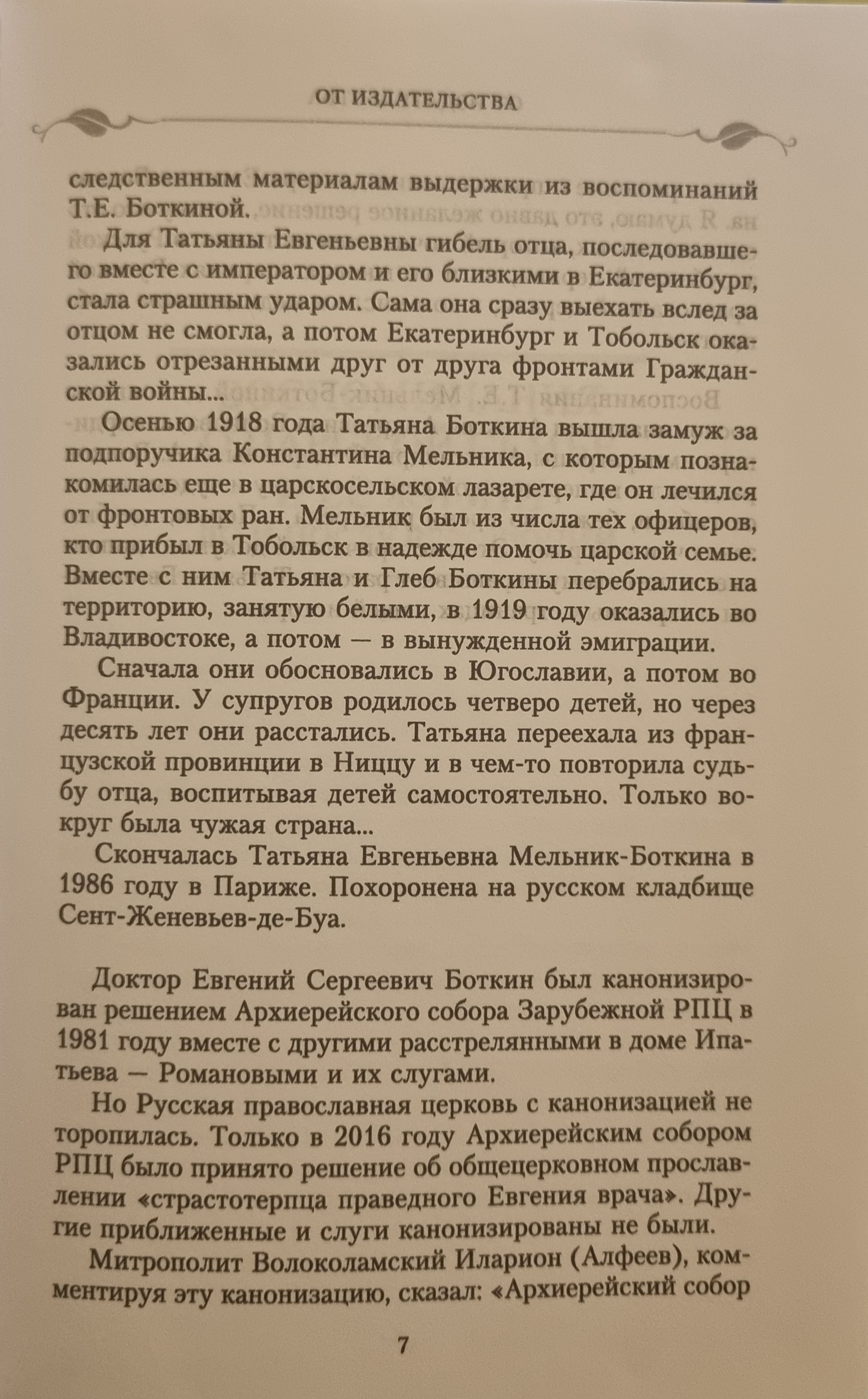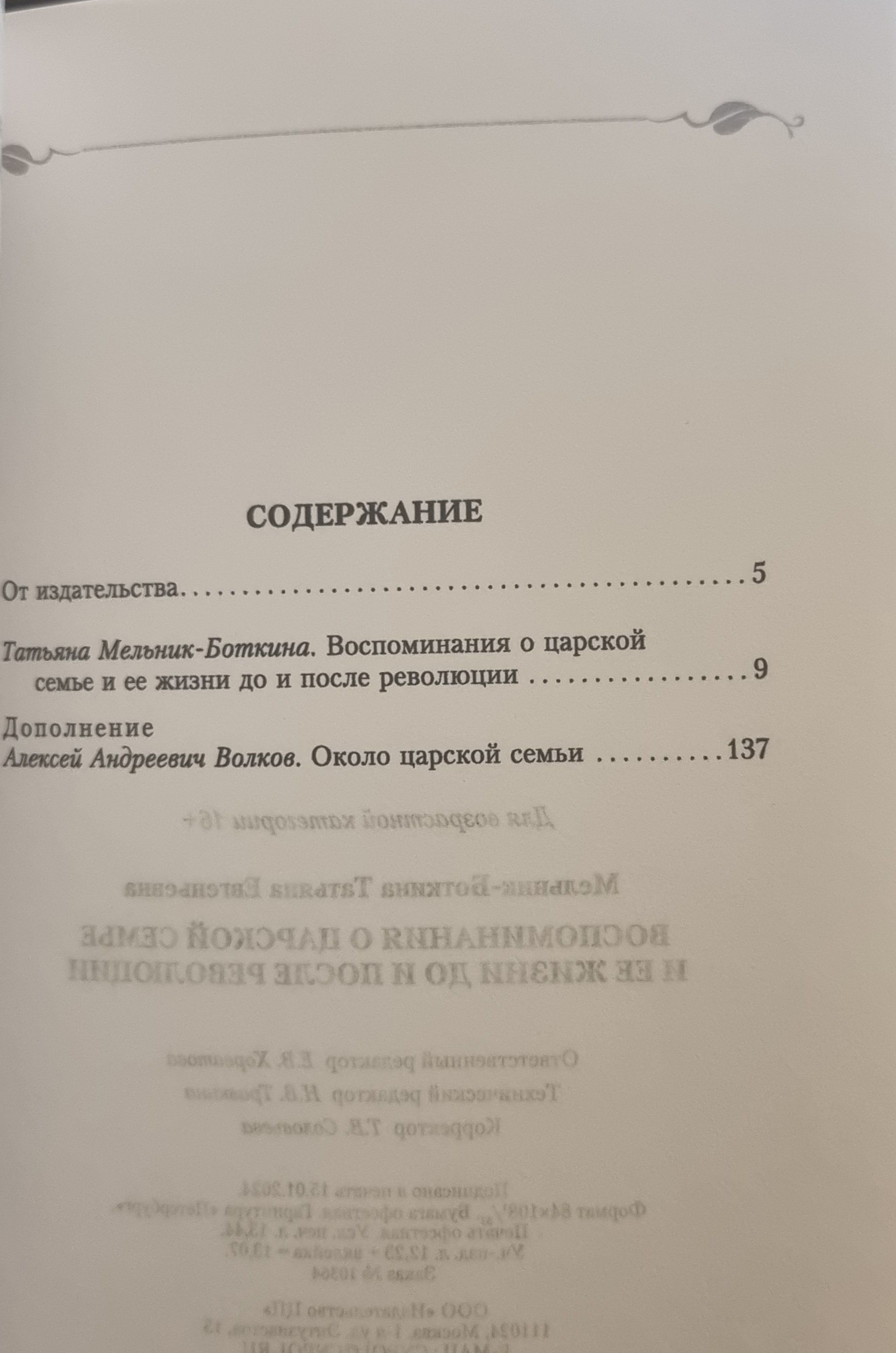 The value of the young girl's memoirs is given by small details from the life of the royal family in exile, an emotional description of the attempts to free them, as well as portraits of those close to her - vivid and femininely precise. In addition, the book contains excerpts from letters written by Dr. Botkin before his execution - with details of life in Yekaterinburg.