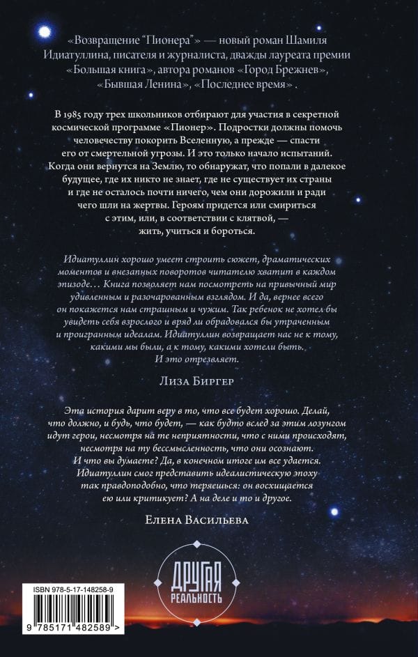 Shamil Idiatullin's science fiction novel "The Return of the "Pioneer"" continues the series "Another Reality". Three Soviet schoolboys participate in a space program aimed at - nothing less - saving humanity from mortal danger. But what matters is not where the crew of the Pioneer flying machine ended up, but when - instead of 1985, Linar, Inna and Oleg returned to 2021. The author turns to the images and conflicts of classic science fiction, unexpectedly shifting the point of focus to actual contemporary prose. An adult story about where childhood dreams lead. The 2020s through the eyes of Soviet schoolchildren. From a cozy nostalgic sai fai, readers, along with the characters, find themselves in a world of lost illusions and inverted meanings. Our modern world.