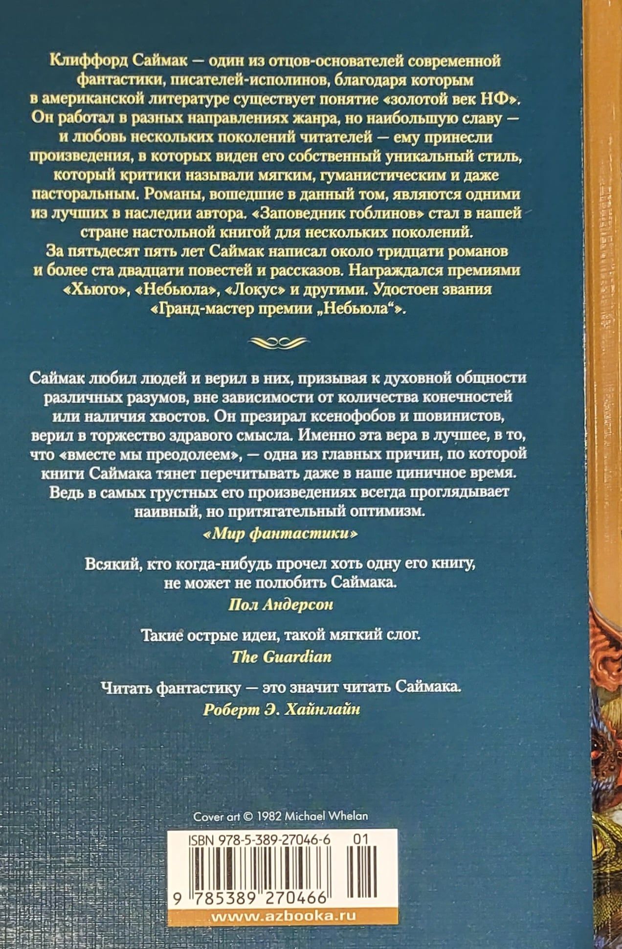 Clifford Simak is one of the founding fathers of modern fiction, the giant writers, thanks to whom in American literature there is a concept of the “golden age of the NF”. At the beginning of his literary career, Saymak wrote "solid" science fiction and adventure works, as well as westerns, but then pushed the boundaries of the NF genre and created his own style, which critics called soft, humanistic and even pastoral, comparing Simak's prose with Bradbury's prose. World fame brought him a novel in the novels “City” (the title novel is included in this collection). For fifty-five years, Saymak wrote about thirty novels and more than one hundred and twenty short stories. He was awarded Hugo, Nebula, Locus and others. He was awarded the title of Grand Master of the Nebula Prize.