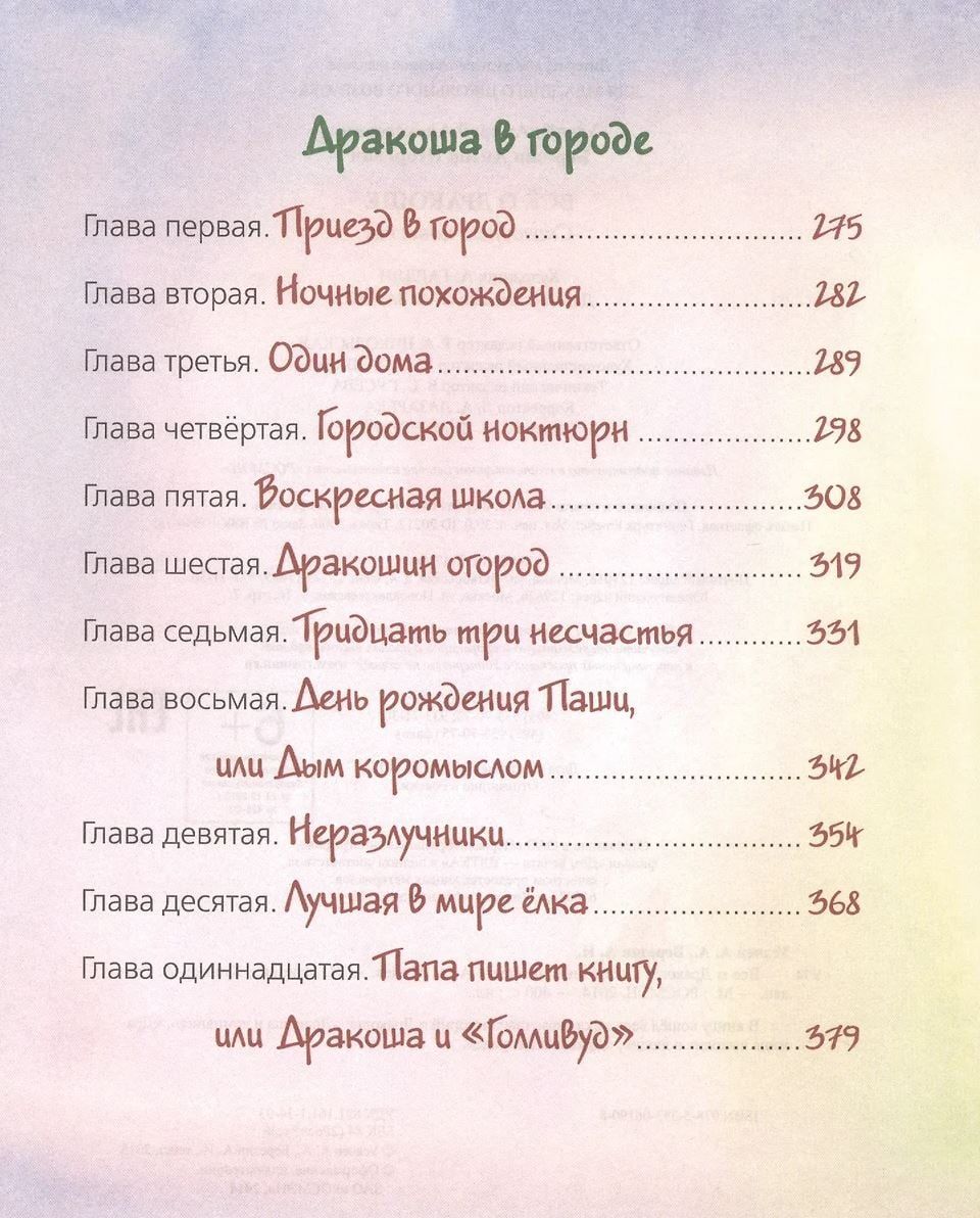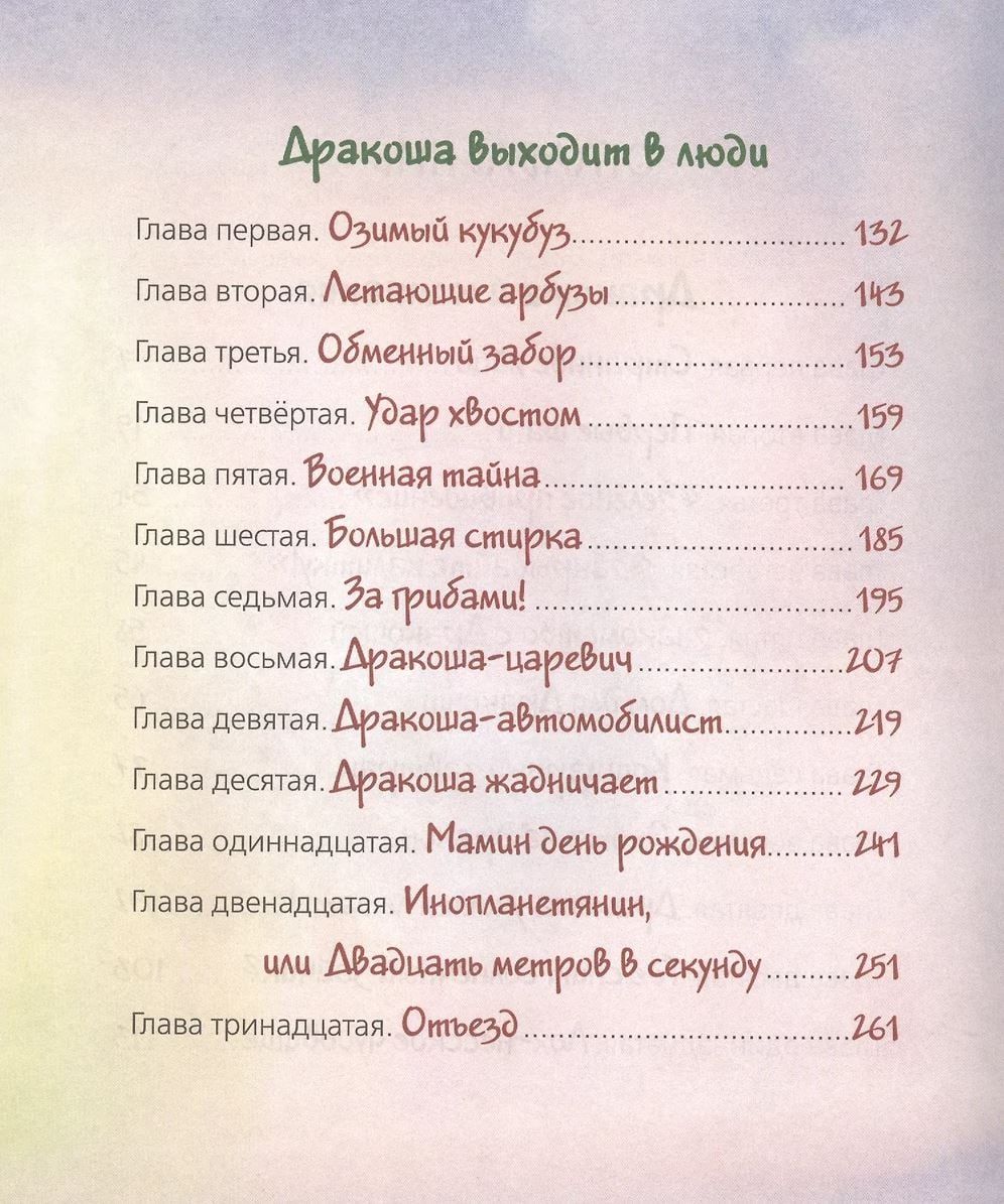 Opens the collection "All about Drakosha" fairy tale story "Drakosha and Company" about the first steps of a little dragon in an ordinary Moscow family Druzhinin. The second part of the fairy tale trilogy, "Drakosha goes to the people", tells about Drakosha's summer adventures at the dacha, about his acquaintance with neighbors in the village and even with the district policeman. And the third, "Drakosha in the city", tells about his new adventures - now in an ordinary Moscow apartment. All three stories are accompanied by illustrations by Anahit Gardyan, thanks to which children once learned what Drakosha looks like and became friends with him.