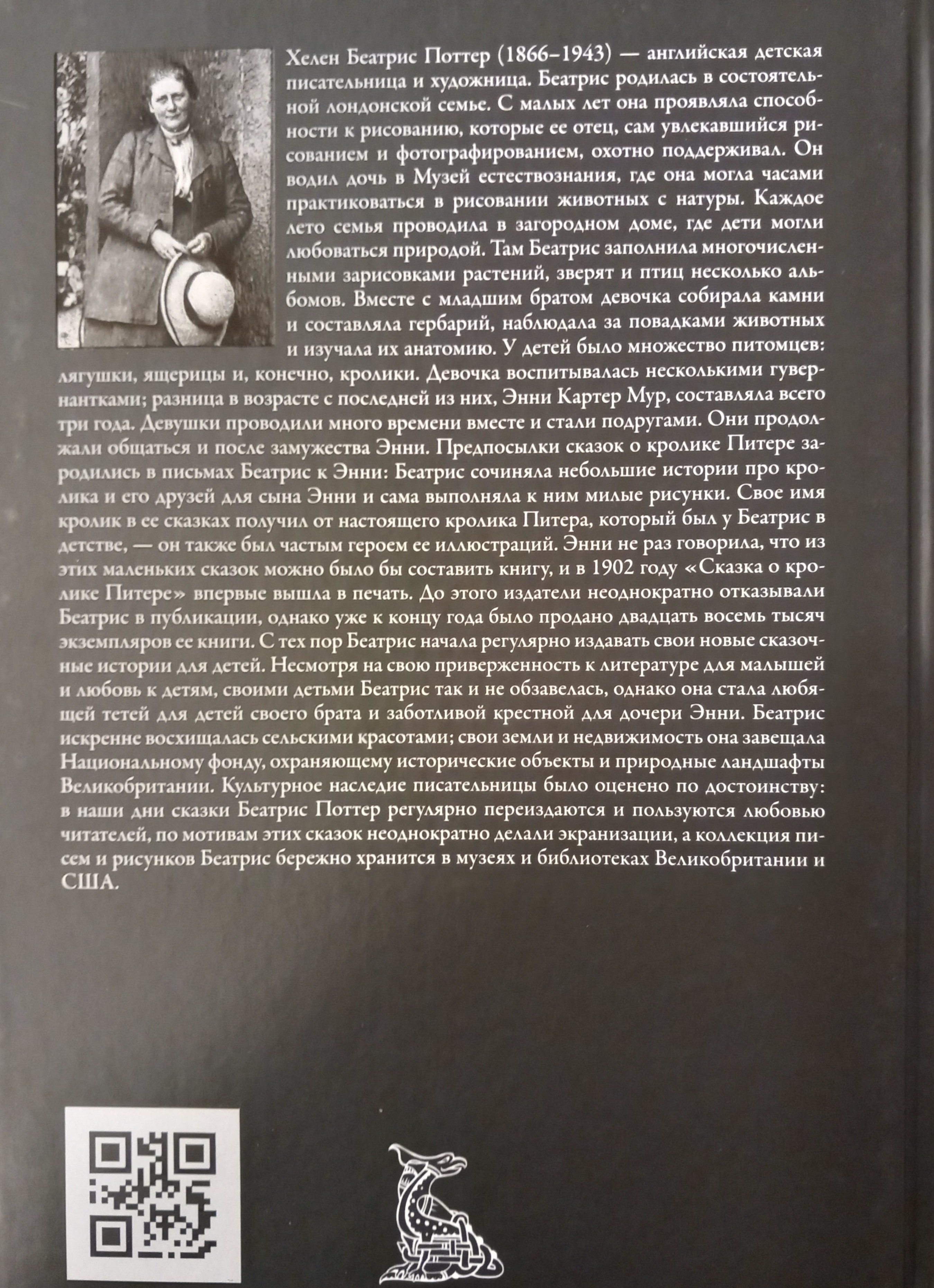 Helen Beatrix Potter (1866–1943) was an English children's author and artist. Her "The Tale of Peter Rabbit" was first published in 1902. From then on, Beatrix began regularly publishing new children's books. Beatrix Potter's stories are now translated into many languages and published in numerous editions. This edition includes twenty-three stories about Peter Rabbit and many other characters created by Potter. The text is translated by Sergei Yuryevich Afonkin.