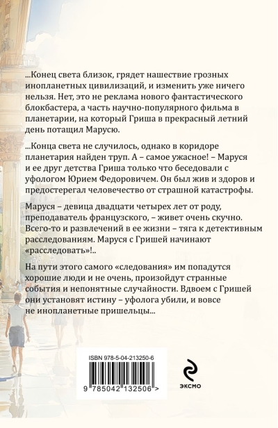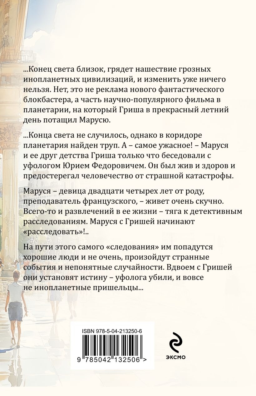 ...The end of the world is near, an invasion of menacing alien civilizations is coming, and nothing can be changed. No, this isn't an ad for a new sci-fi blockbuster, but part of a popular science film at the planetarium, which Grisha dragged Marusya to see on a beautiful summer day. ...The end of the world didn't happen, but a corpse was found in the planetarium corridor. And – the worst part! – Marusya and her childhood friend Grisha had just spoken with ufologist Yuri Fyodorovich. He was alive and well and warned humanity of a terrible catastrophe. Marusya, a twenty-four-year-old French teacher, lives a very boring life. The only entertainment in her life is a passion for detective work. Marusya and Grisha begin to "investigate"! Along the way, they will encounter good people and not so good people, strange events and incomprehensible coincidences will occur. Together with Grisha, they will establish the truth: the ufologist was killed, and not by aliens at all...