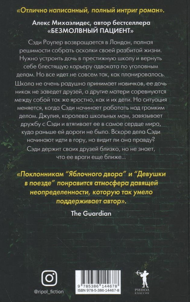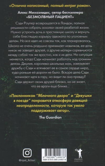 Tice G. is the author of the book Blood Orange, which became a bestseller worldwide in the genre of female detective. “All Your Lies” is a strong psychological thriller, hiding its secrets of the plot on unremarkable female stories of everyday life and leisure. Sadie Roper returns to London determined to pick up the pieces of her shattered life. You need to get your daughter into a prestigious school and regain a brilliant career as a criminal lawyer. But things are not going quite as planned. The school does not welcome newcomers, her daughter does not make friends, and other mothers compete with each other as fiercely as their children. But things change when Sadie starts working on a high-profile case. Julia, the queen of high school moms, strikes up a friendship with Sadie and drags her into the heart of the world, where she had no way before. Soon Sadie's affairs begin to go uphill, but does she see the truth? Sadie keeps her friends close, but doesn't know her enemies are any closer. . .