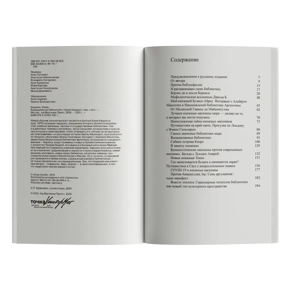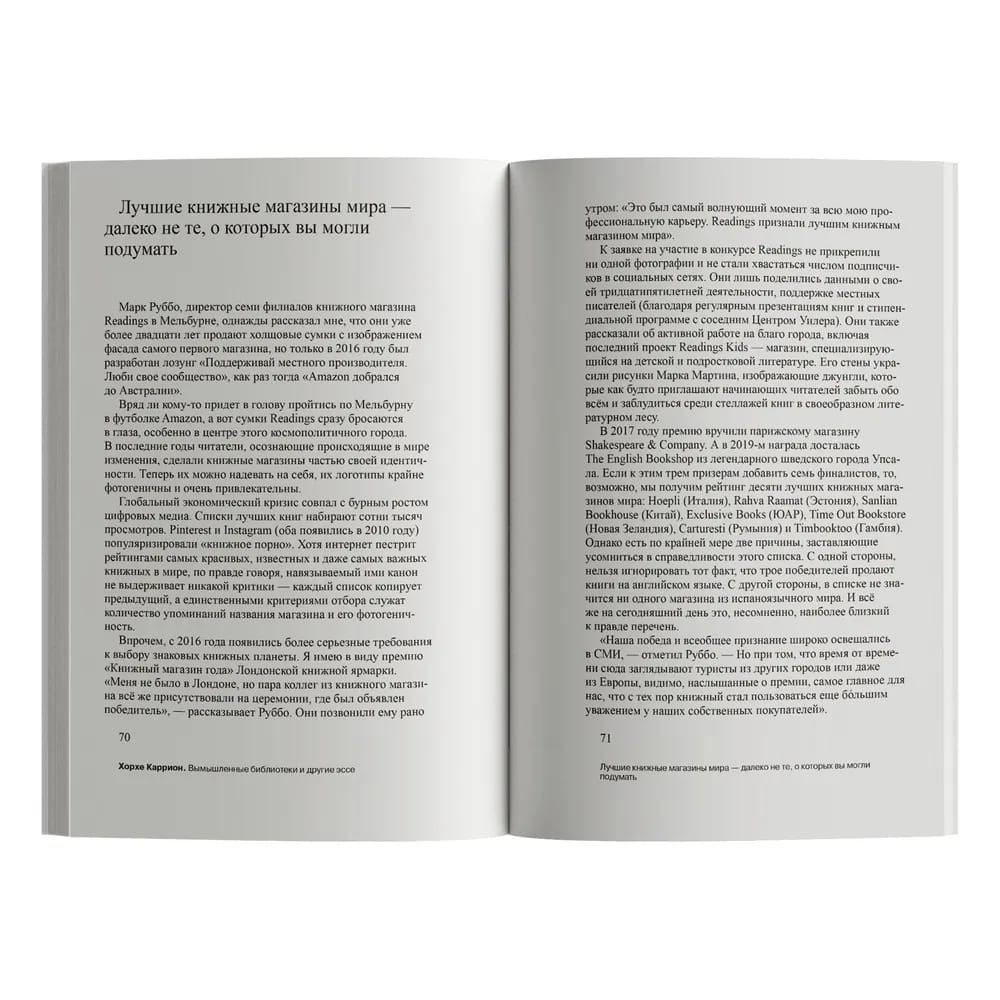 A tireless explorer of the book territory, Carrión sensitively registers its changes: digitalization and the threat from marketplaces, new store formats, the new life of libraries, the renaissance of book spaces of experiences in South Korea and Japan. And, of course, once again he declares his love for books, bookstores and libraries - not only physical ones, but also fictional ones. Those that famous authors - Cervantes, Verne, Borges - gave us in their works, and those that exist inside each of us.