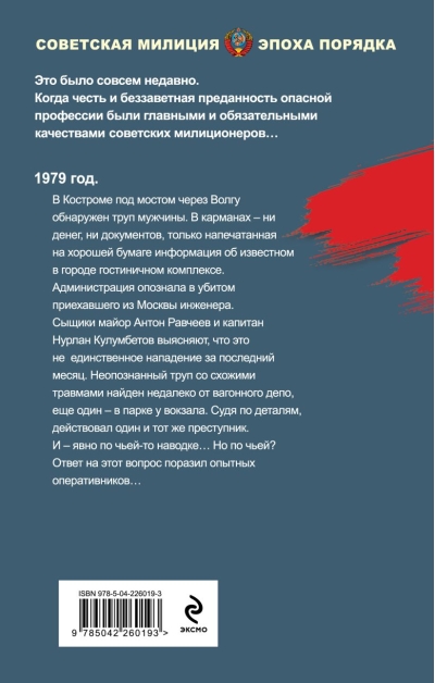 1979. In Kostroma, a man's body is found under a bridge over the Volga. His pockets contained no money or documents, only information about a well-known hotel complex in the city, printed on good paper. The administration identified the dead man as an engineer visiting from Moscow. Detectives Major Anton Ravcheyev and Captain Nurlan Kulumbetov discover that this is not the only attack in the past month. An unidentified body with similar injuries was found near the train depot, and another in the park near the train station. Judging by the details, the same perpetrator acted. And clearly on someone's tip... But whose? The answer to this question stunned the experienced detectives...