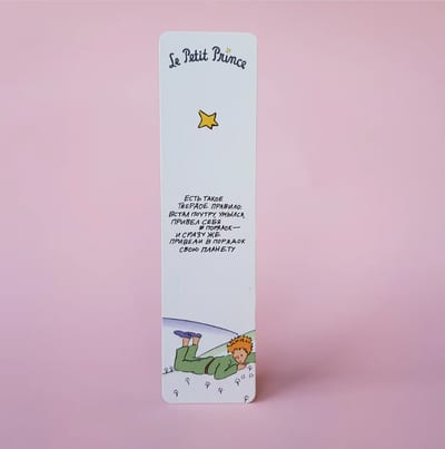 An elegant bookmark on designer cardboard is made in pastel colors, decorated with an illustration and a quote from everyone’s favorite work “The Little Prince”.
