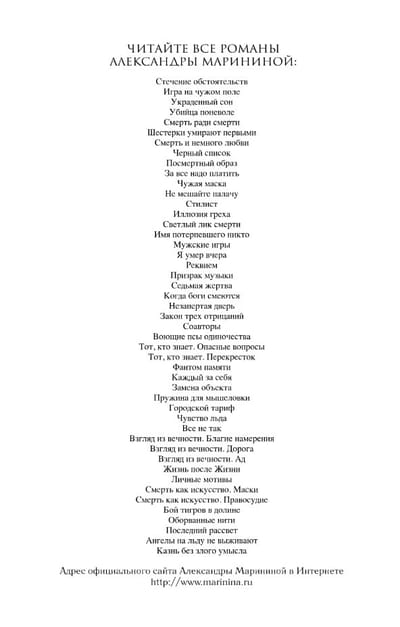 Two people have been murdered—the young wife of a successful businessman and her bodyguard. Is this a warning to a successful competitor, revenge against a flighty beauty, or the settling of old scores? There are many theories, but none of them appeal to the humble local police officer, Captain Igor Doroshin, who has a personal stake in the investigation. At his own risk, or rather, following a vague instinct, he pursues his own theory. After all, when it comes to human passions, even the most indisputable facts cannot be trusted. It seems obvious that a bullet's path always lies between two people—the shooter and the one being shot at. But this is only an illusion; there are many more people in its path...