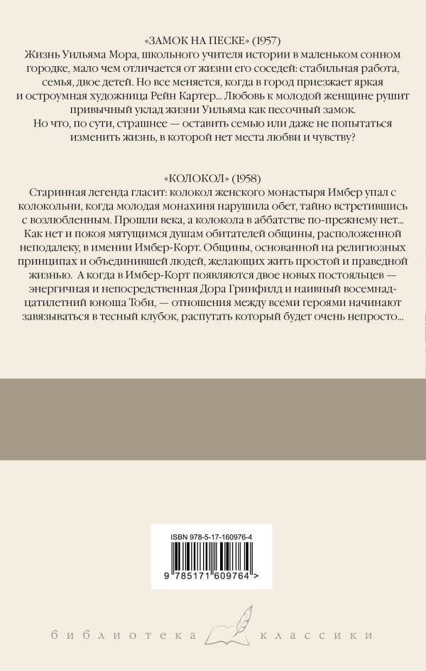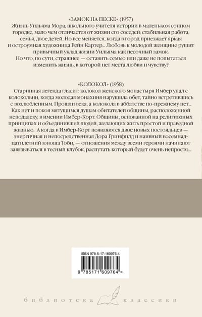 "Castle on the Sand" (1957). The life of William Mora, a school history teacher in a small sleepy town, not much different from the lives of his neighbors: a stable job, a family, two children. But everything changes when a bright and witty artist Rain Carter comes to town... Love for the young woman ruins William's usual way of life like a sandcastle. But what, in fact, is scarier - to leave the family or not try to change the life in which there is no place for love and feeling? "The Bell" (1958). An old legend says: the bell of the convent of Imber fell from the bell tower when a young nun broke her vow by secretly meeting her lover. Centuries later, the bell is still missing from the abbey... Nor is there any peace for the troubled souls of the nearby community of Imber Court. A community founded on religious principles and united people who want to live a simple and righteous life. And when two new residents appear in Imber Court - energetic and direct Dora Greenfield and a naive eighteen-year-old young man Toby - the relationship between all the characters begin to knot up in a tight tangle, which will be very difficult to untangle....