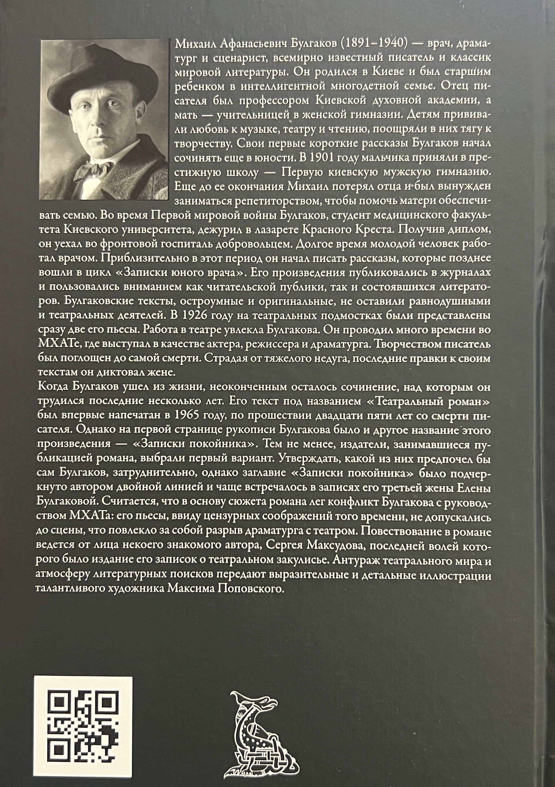 Mikhail Afanasyevich Bulgakov (1891–1940) was a doctor, playwright and screenwriter, a world-famous writer and classic of world literature. When Bulgakov passed away, he left unfinished the work he had been working on for several years, “Notes of the Dead”. It is believed that the plot of the novel is based on Bulgakov’s conflict with the management of the Moscow Art Theatre: his plays, due to censorship considerations of the time, were not allowed to be staged, which led to the playwright’s break with the theatre. The novel is narrated by a certain acquaintance of the author, Sergei Maksudov, whose last will was to publish his notes about the theatre backstage. The entourage of the theatre world and the atmosphere of literary searches are conveyed by expressive and detailed illustrations by the talented artist Maxim Popovsky.