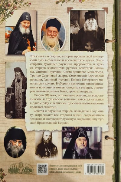 This book is about elders who walked their pastoral path in Soviet and post-Soviet times. It contains spiritual teachings, prophecies and miracles of elders of famous Russian monasteries: Valaam, Optina Pustyn, St. Daniel Monastery, Trinity Lavra of St. Sergius, Smolensk Zosima Pustyn, Glinsk Pustyn, Pskov-Pechersky Monastery and others. The collection includes biographies and teachings of lesser-known elders, about whom the reader may read for the first time.