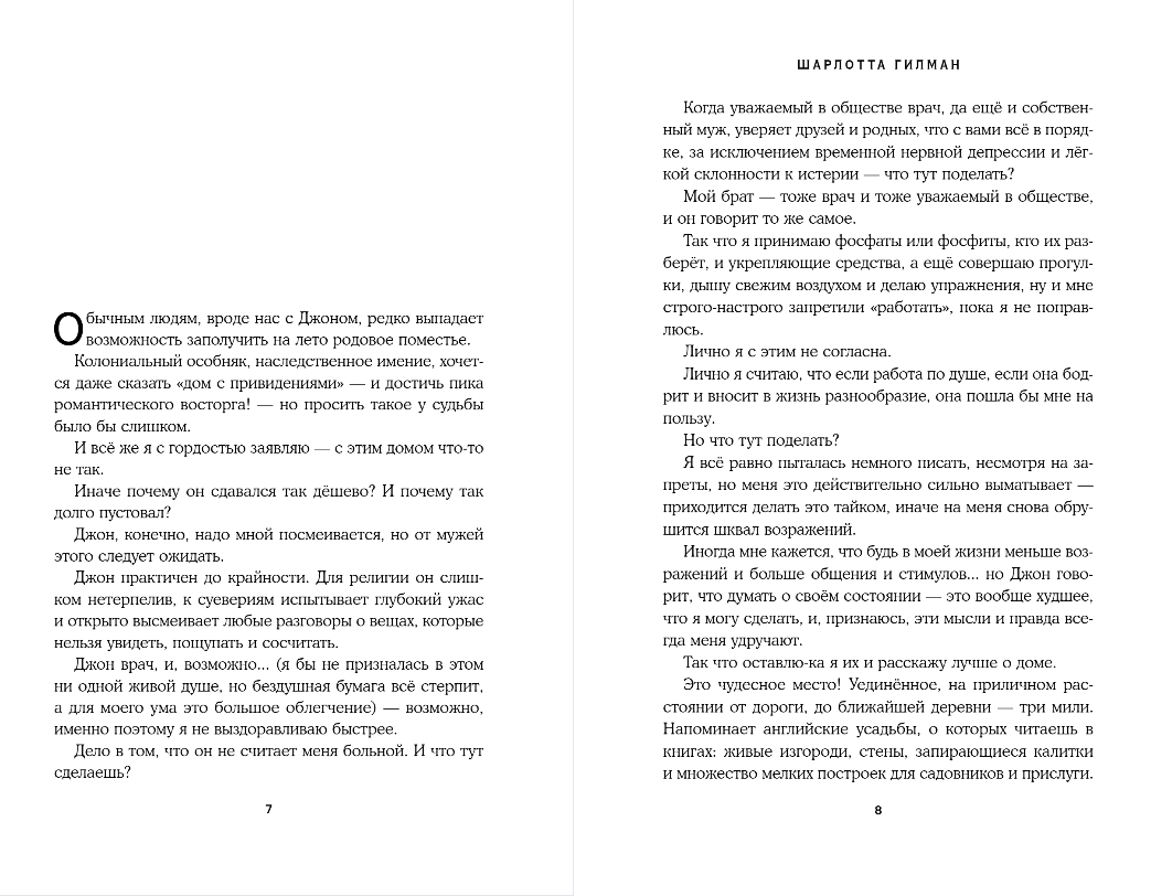 The story is written as a collection of diary entries, narrated in the first person. A woman who has recently given birth, whose doctor husband has rented an old mansion for the summer, is troubled by the hideous yellow wallpaper left in the nursery on the second floor. The heroine cannot bear the sight of this wallpaper, seeing various disturbing images, and we are gradually drawn into her state.