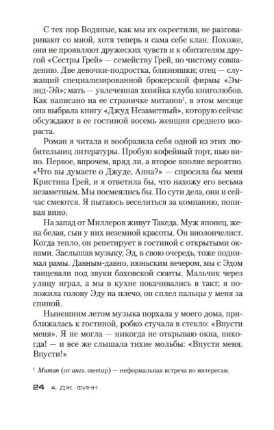 Anna Fox lives as a hermit in her New York home. About a year ago, she suffered severe stress, so she cannot go outdoors. Her loved ones have abandoned Anna, although she talks to them on the phone every day. Still, she wants to believe that life will change for the better. She spends her time watching old movies, reminiscing about happy days, her favorite job ... and sometimes, out of boredom, she spies on her neighbors. One day new tenants appear in the house across the square: a father, a mother, and a teenage son. A prosperous, simply perfect family. But one day Anna, pointing a camera lens out the window, sees a scene that shocks her - a scene of brutal murder. The woman raises the alarm, but the neighbors refute everything she says. No one believes her - neither the police nor her friends - and her world begins to crumble ... Then she decides to find out for herself where truth and fiction lie.