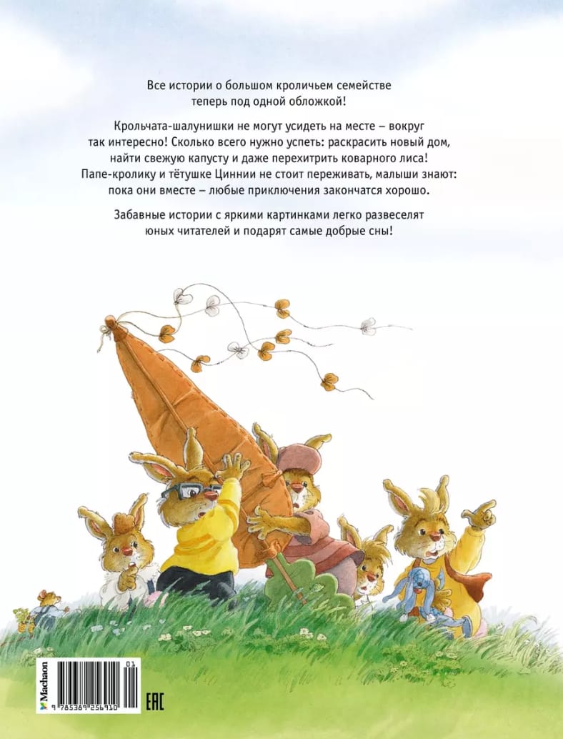 All the stories about the big rabbit family now under one cover. The naughty little rabbits can't stay still, they are so excited. How many things they have to manage: to paint a new house, to find fresh cabbage, and even to outwit the wily fox. Daddy Rabbit and Auntie Cinia don't have to worry, the kids know that as long as they are together, any adventure will end well. Funny stories with bright pictures will easily cheer up young readers and give the kindest dreams.