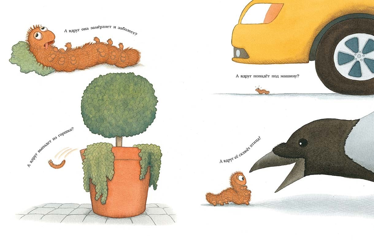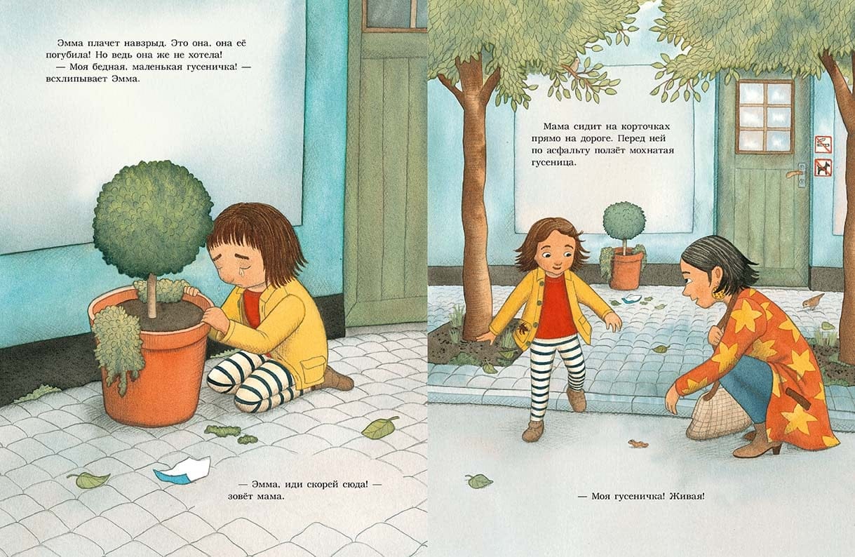 Emma is very fond of animals. In her garden, her bird feeder is always full of seeds for the birds. And at home she has her own little zoo in a glass jar. One day, on her way to the hairdresser, she notices a caterpillar in the grass. Emma thinks the caterpillar is cold, and takes it with her to warm it up. But the cafe she and her mother visit doesn't allow animals, so Emma hides the caterpillar in a large pot at the entrance. After a quick snack, they run to the hairdresser's, and in the rush Emma forgets about her caterpillar. When she remembers, she jumps out of her chair and rushes back. Scary images flash before her eyes. What if the caterpillar freezes and gets sick? What if it falls out of the pot? What if it gets hit by a car? What if it gets pecked by a bird? And it's all her fault, Emma! So she bends over the flower, and there's nothing in the pot. Emma cries and through her tears she hears her mother's voice. Mommy is squatting right on the road. In front of her, a furry caterpillar is crawling along the asphalt - safe and sound! Joyful Emma carries her caterpillar into the forest and builds it a cozy nest under a big stump.