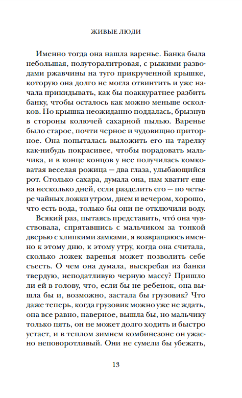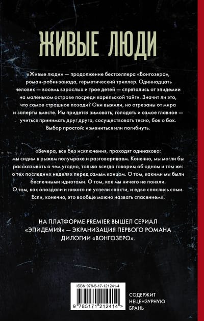 "Living People" is the sequel to the bestselling "Vongozero", a novel of robinsonade, hermetic thriller. Eleven people - eight adults and three children - have hidden from the epidemic on a small island in the middle of the Karelian taiga. Does that mean the worst is over? They survived, but are cut off from the world and locked up together. They will have to hibernate, starve and most importantly - learn to accept each other, to coexist closely, side by side. The choice is simple: change or perish.