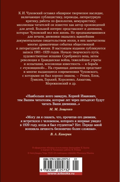 K. I. Chukovsky left behind a vast creative legacy, including journalism, translations, literary criticism, works on philology, and memoirs. Of great interest are the diaries he kept throughout his life. This edition features entries from 1901–1929. The beginning of his creative career, the artistic explorations of the Silver Age, then the Revolution and Civil War, the gravest losses and trials, nationwide fame—and the struggle against "Chukovskyism"... The diaries also feature many of Chukovsky's outstanding contemporaries, with whom he was well acquainted—Repin, Blok, Gumilev, Gorky, Korolenko, Akhmatova, Merezhkovsky, and others.