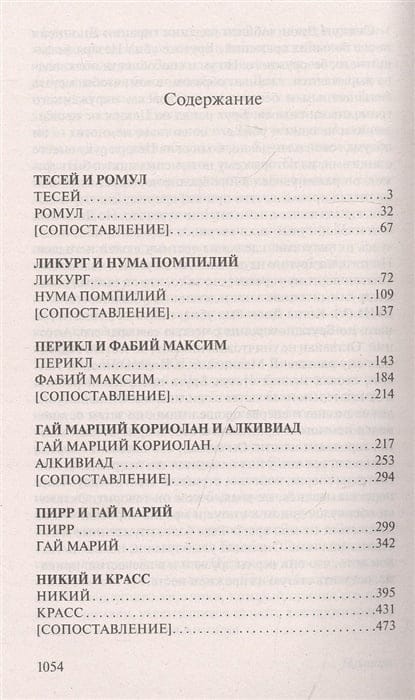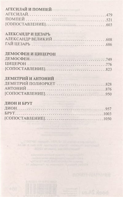 The collection includes selected biographies of the author, whose task was to compile as accurately and correctly as possible biographies of legendary figures of the past, such as the winner of the Minotaur Theseus and the founder of Rome Romulus, semi-legendary rulers (such as Lycurgus and Numa Pompilius) and quite historical kings and emperors, politicians and military leaders, tyrants and tyrannopolitans. Under Plutarch's lively and vivid pen, Alexander the Great and Gaius Julius Caesar, the idol of democratic Athens Pericles and the passionate inconsistent hedonist Alkibiades literally come to life in the fullness and ambiguity of their characters, the favorite of late republican Rome Pompey the Great and the stern stoic Cicero, the frivolous Mark Antony and many other famous darlings and stepchildren of the fate of ancient Greece and Rome, who in one way or another left a noticeable trace in human memory.